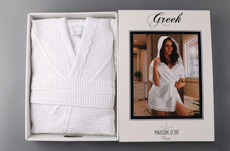 При изготовлении халата серии "GREEK" торговой марки "Maison D'or" используется вафельная ткань на основе волокон хлопка, что обеспечивает изделию экологичность, гипоаллергенность, оптимальное сочетание мягкости и прочности, гигроскопичности и воздухопроницаемости.