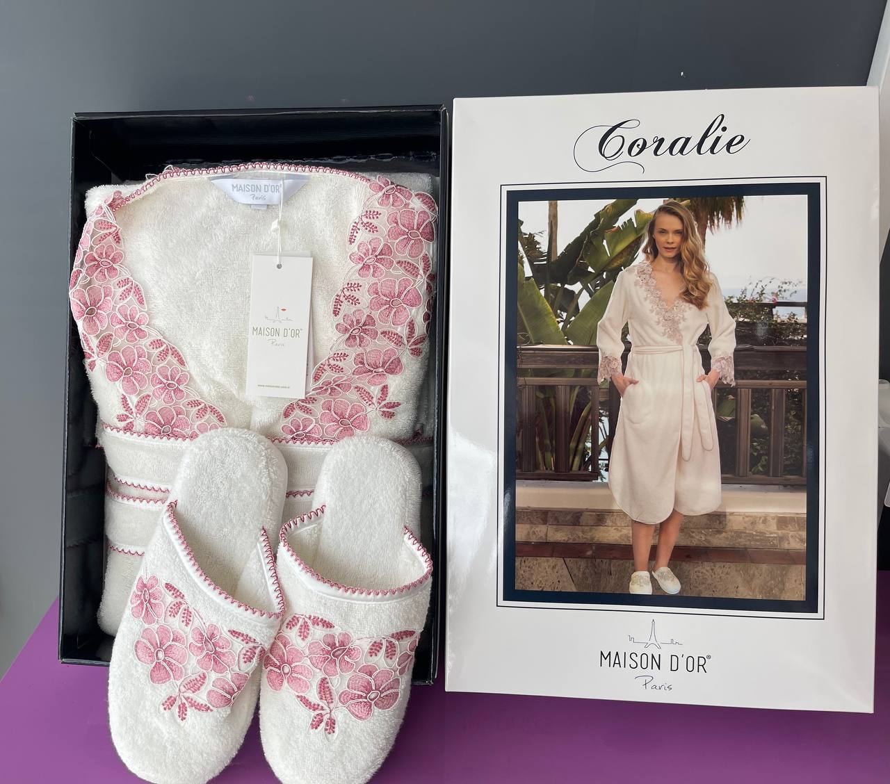 Отзывы о Халат женский махровый с тапочками Maison D'or "CORALIE" (кремовый/пыльная роза)