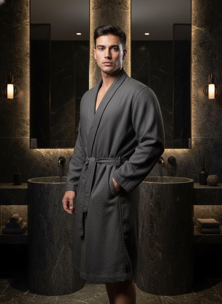 При пошиве халата серии "Дориан" используется 100% хлопок, что обеспечивает изделию экологичность, гипоаллегренность, отличную воздухопроницаемость и гигроскопичность, приятные тактильные ощущения.