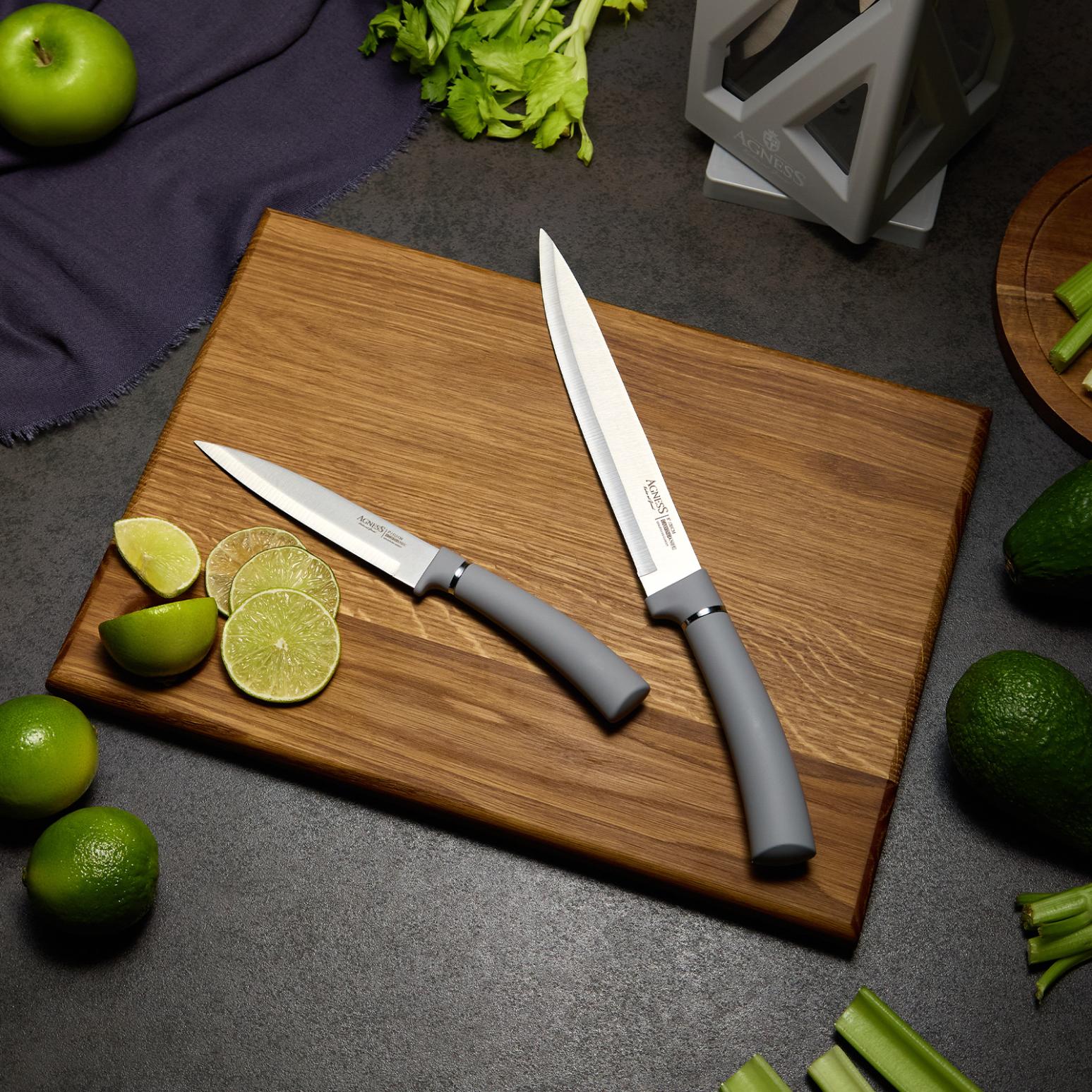 ● Состав набора: Нож поварской 20 см, Нож для хлеба 20 см, Нож для нарезки 20 см, Нож универсальный 12,5 см, Нож для чистки овощей и фруктов, 9 см, Пластиковая подставка.