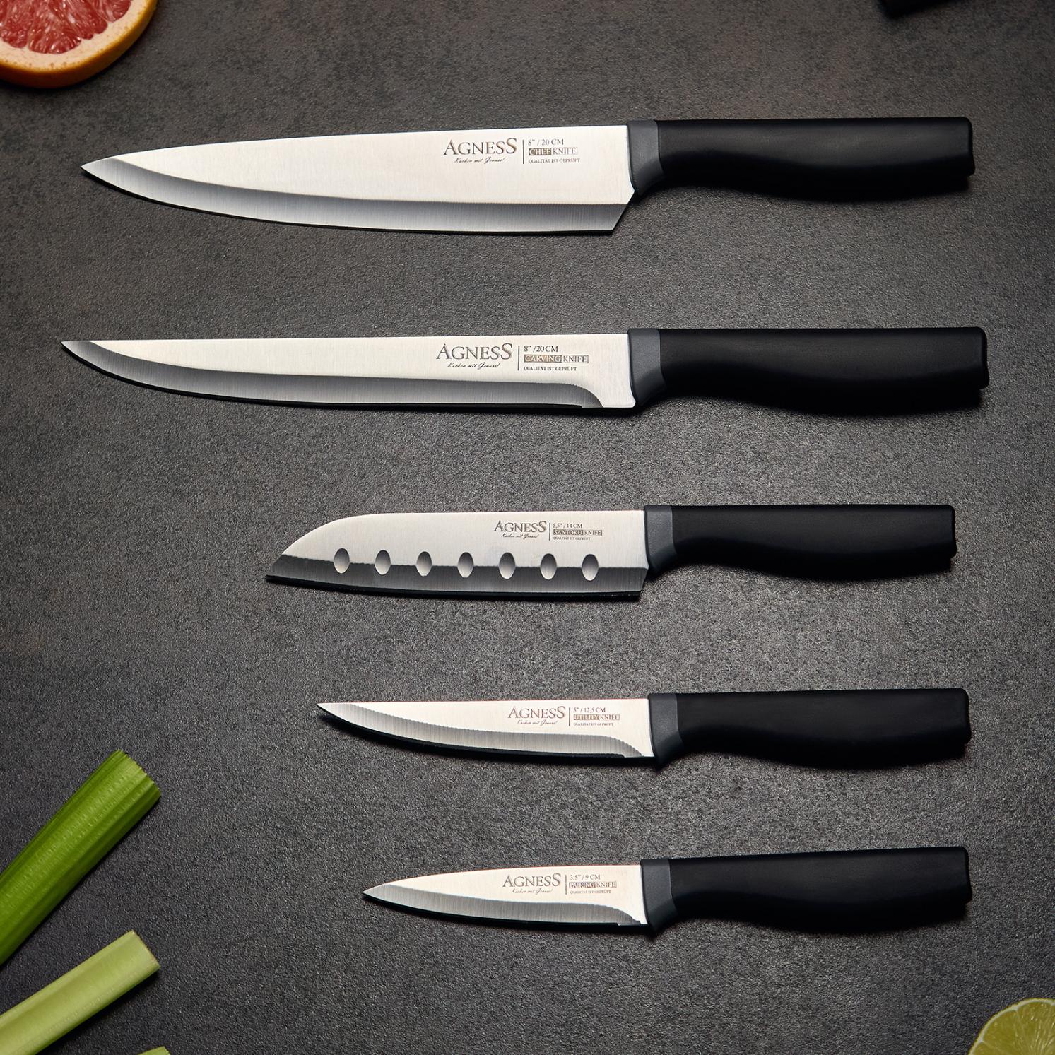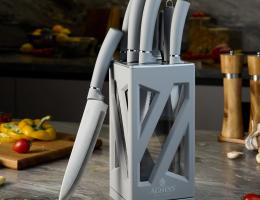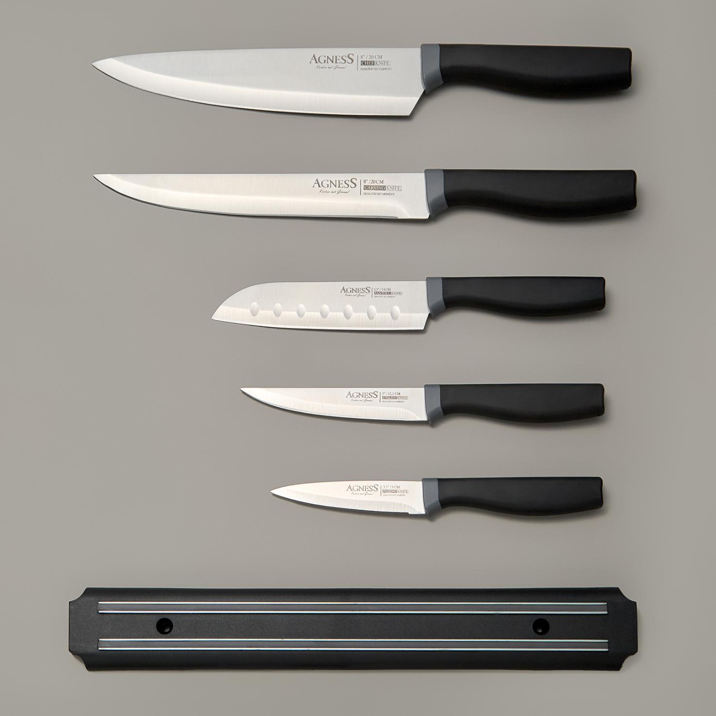 ● Состав набора: Нож поварской 20 см, Нож разделочный 20 см, Нож сантоку 15 см, Нож универсальный 12,5 см, Нож для чистки овощей и фруктов, 9 см, Магнитный держатель для безопасного хранения ножей