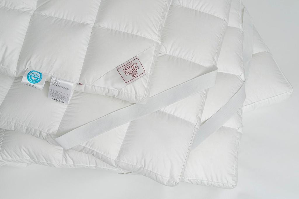 Пуховая перина серии "ROYAL DOWN GRASS" выполнено в чехле из пуходержащего мако-твила (100% Египетский хлопок), прошедшего финишную обработку SanProCare® Sensitive, что позволяет ткани добиться состояния "пуховой мягкости". В качестве наполнителя используется отсортированный вручную белый гусиный пух с показателем упругости Fill Power не менее 850 единиц. Наполнитель уложен в кассеты высотой 6 см, что предотвращает миграцию пуха по периметру изделия. Для крепления перины к матрасу используются резинки по углам.