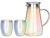 Набор состоит из кувшина и двух стаканов, выполненных из жаропрочного стекла, способного выдерживать температуру кипящей воды. Кувшин укомплектован плотно закрывающейся крышкой с силиконовым уплотнителем.