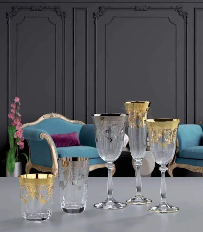 При производстве набора для питья данной серии торговой марки «Cre Art» используется художественное стекло с покрытием золотом (24 карата) или платиной.