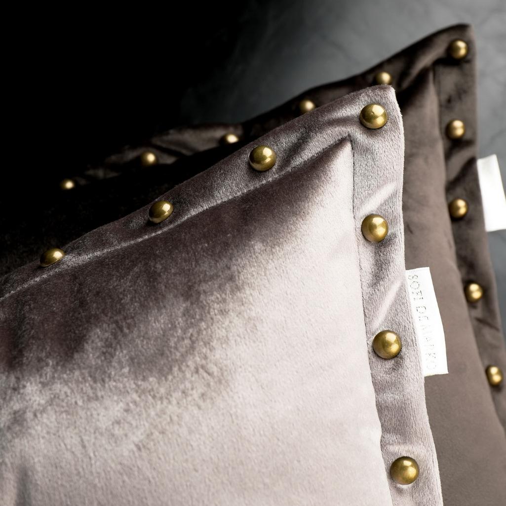 При пошиве декоративных наволочек серии Людвиг ТМ "«Sofi de Marco»" используется велюр (100% вискоза). Велюр (в переводе с французского – бархат) - ворсовый материал, отличающийся, с одной стороны, прочностью и долговечностью, мягкостью и практичностью, с другой - привлекательным внешним видом. Наволочки декорированы клепками по канту, напоминающие пуговицы сферическое формы. В качестве ухода рекомендована стирка при температуре 30 °C.