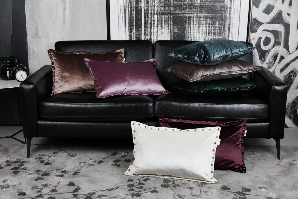 При пошиве декоративных наволочек серии Людвиг ТМ "«Sofi de Marco»" используется велюр (100% вискоза). Велюр (в переводе с французского – бархат) - ворсовый материал, отличающийся, с одной стороны, прочностью и долговечностью, мягкостью и практичностью, с другой - привлекательным внешним видом. Наволочки декорированы клепками по канту, напоминающие пуговицы сферическое формы. В качестве ухода рекомендована стирка при температуре 30 °C.