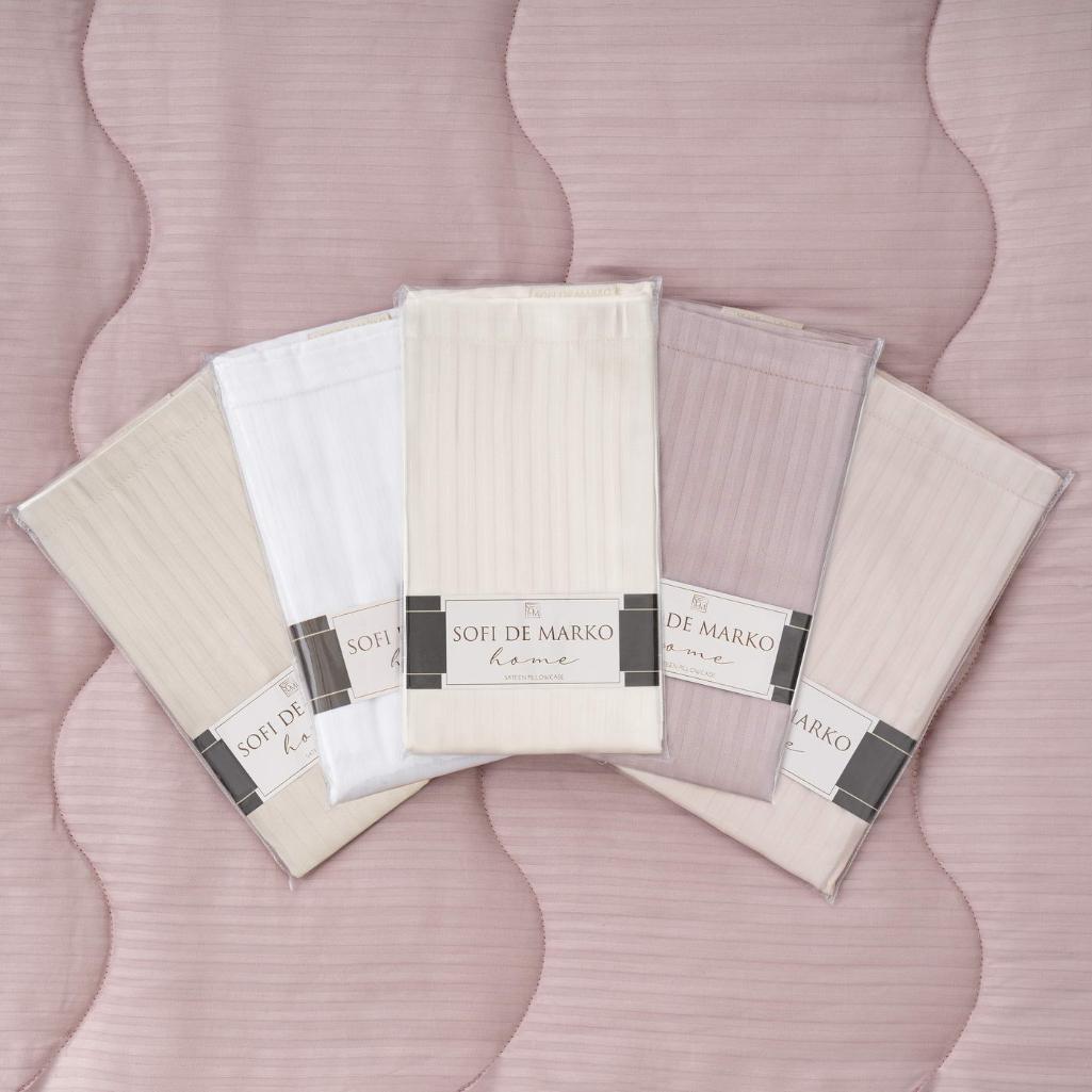 При пошиве наволочек серии Тиффани ТМ "«Sofi de Marco»" используется страйп-сатин (100% хлопок). Страйп-сатин - представляет собой удачное сочетание сатина и жаккарда. Основа материала выполнена из сатина, а полосы той же тональности в жаккардовом переплетении волокон. Помимо эстетической составляющей для предметов постельного белья из страйп-сатина характерны очень высокий уровень прочности и износостойкости, экологичность и гипоаллергенность, гигроскопичность и воздухопроницаемость. В качестве ухода рекомендована стирка при температуре 40 °C.