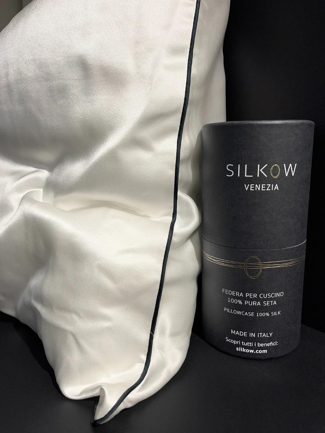 Наволочки "SILKOW" отшиваются в Венеции из натурального шёлка класса Mulberry. Натуральный шёлк обладает хорошей гигроскопичностью и терморегулирующими свойствами, в нём содержится белок — серицин, благотворно влияющий на кожу и препятствующий появлению клещей и бактерий.