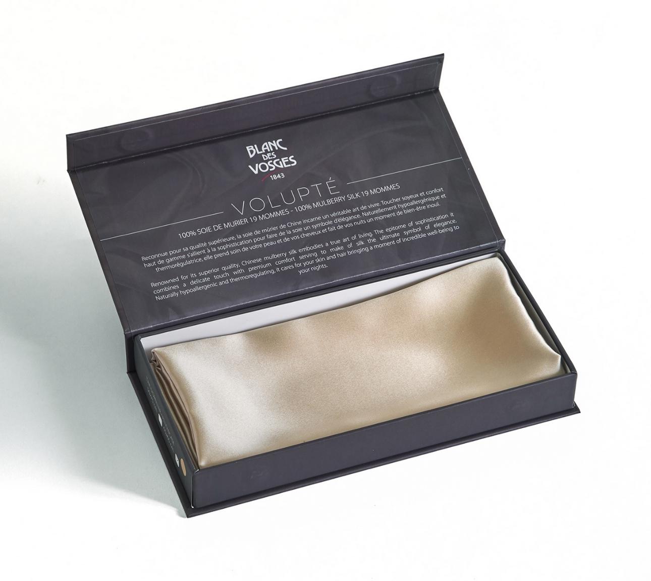Наволочки "Volupté Ardoise" отшиваются из натурального шёлка плотностью 19 момми. Натуральный шёлк обладает хорошей гигроскопичностью и терморегулирующими свойствами, в нём содержится белок — серицин, благотворно влияющий на кожу и препятствующий появлению клещей и бактерий.