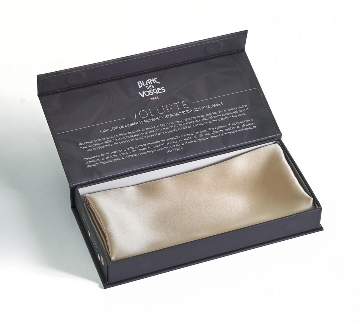 Наволочки "Volupté Ardoise" отшиваются из натурального шёлка плотностью 19 момми. Натуральный шёлк обладает хорошей гигроскопичностью и терморегулирующими свойствами, в нём содержится белок — серицин, благотворно влияющий на кожу и препятствующий появлению клещей и бактерий.