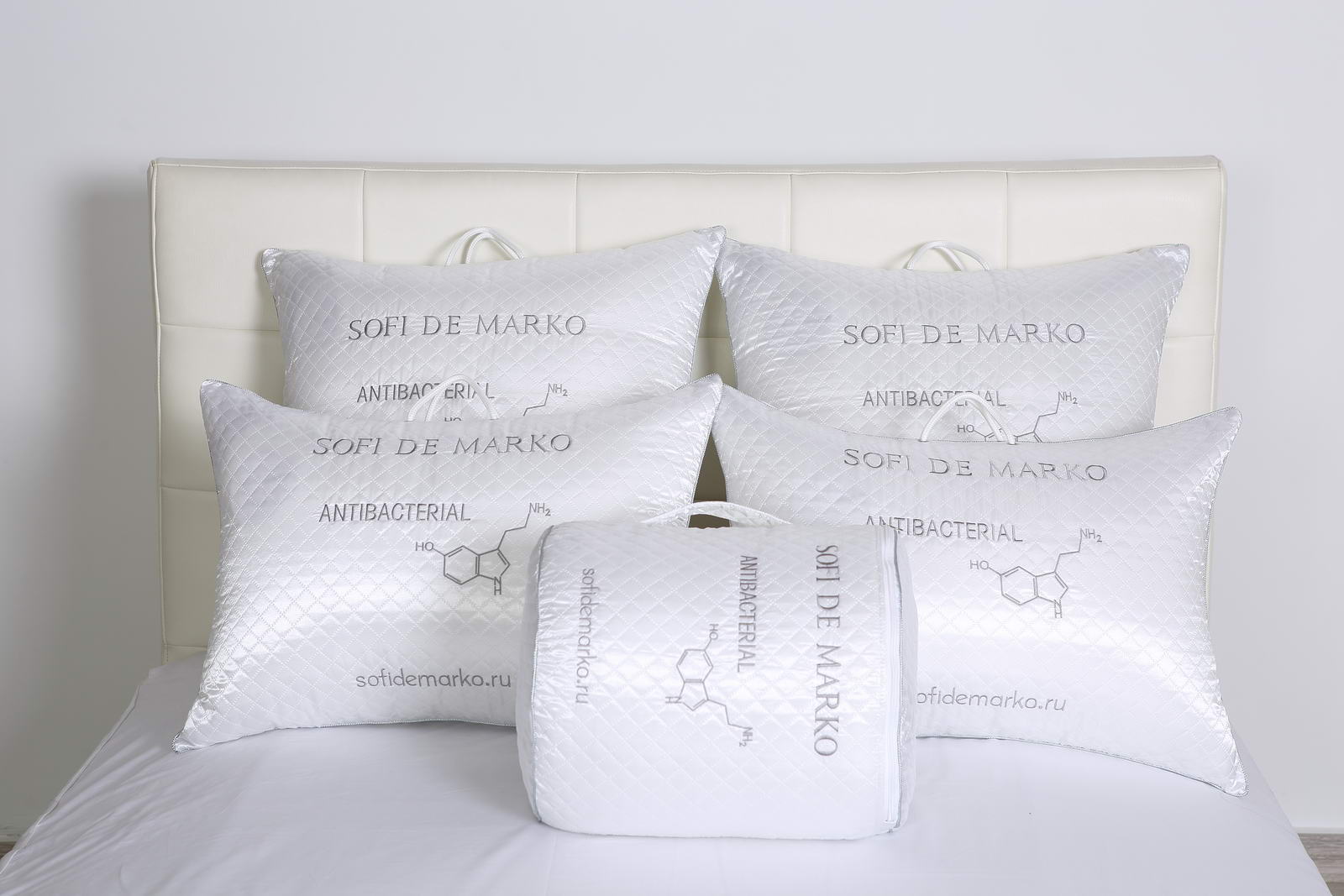 Подушка Antibacterial торговой марки "Sofi de Marko" выполнена в чехле из смеси волокон вискозы и хлопка с наполнителем из соевого и микро(нано)волокна, спиралевидные пружины которого обладают способностью сжиматься и разжиматься, что обеспечивает правильную микроциркуляцию воздуха во время сна, позволяет изделию быстро восстанавливать форму и сохранять свою функциональность в течение длительного времени. Соевое волокно известно своими целебными свойствами: способствует нормализации сна, тормозит воспалительные процессы, замедляет увядание кожи. Микроволокно обработано специальным антибактериальным компонентом.