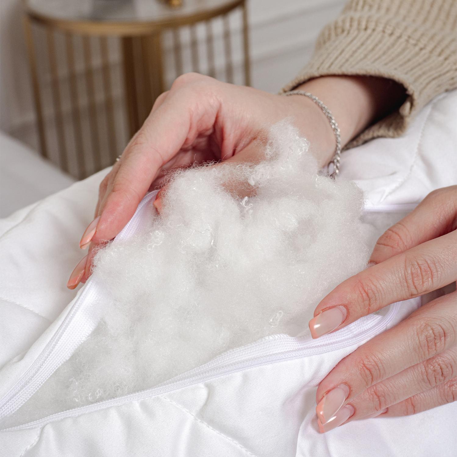 Подушка серии «TENCEL & SATEEN» выполнена в стёганом сатиновом чехле (100% хлопок). В качестве наполнителя чехла используется эвкалиптовое волокно - тенсел. Эвкалиптовое волокно экологически чистое, не вызывает аллергию, обладает высокой воздухопроницаемостью, отлично впитывает влагу, нежное и приятное на ощупь. Наполнитель ядра подушки - микроволокно.