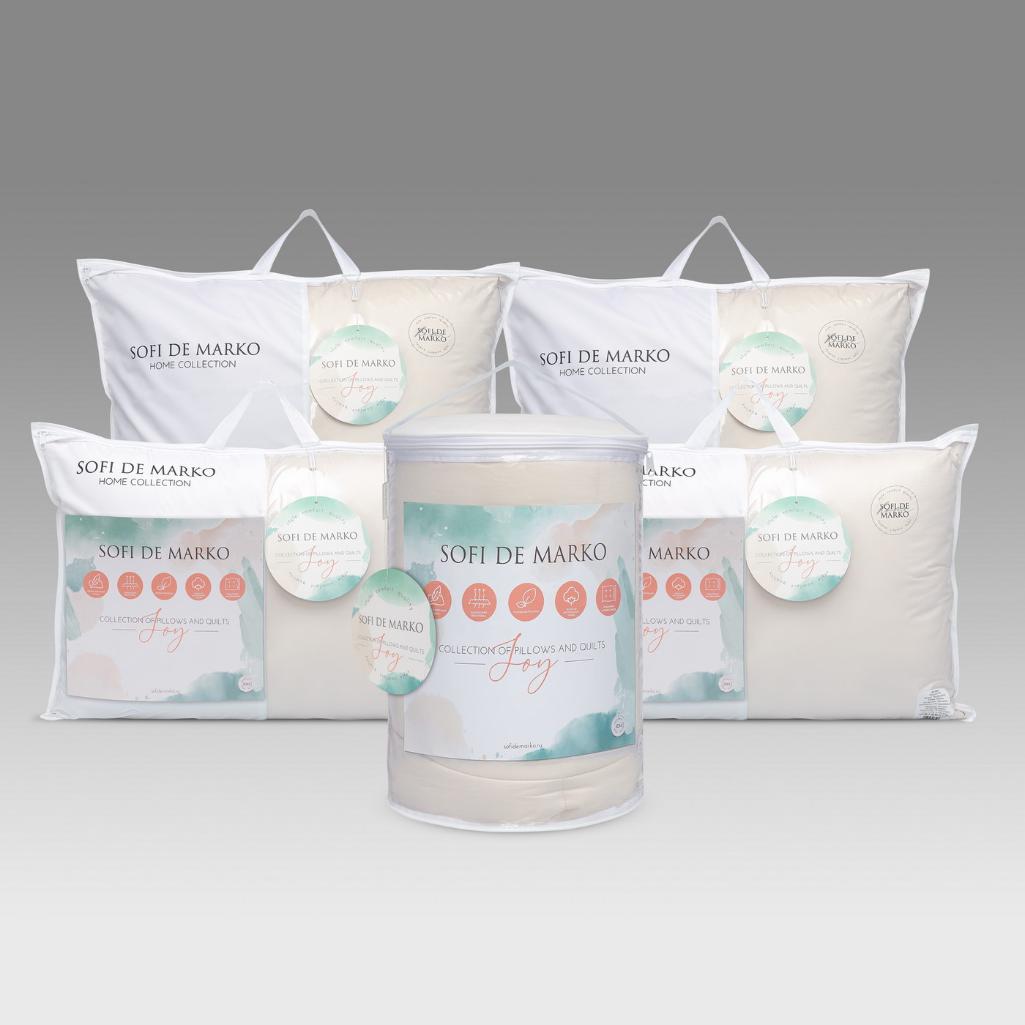 Подушка JOY торговой марки "Sofi de Marko" выполнена в чехле из сатина с наполнителем из шёлка и искусственного лебяжьего пуха, спиралевидные пружины которого обладают способностью сжиматься и разжиматься, что обеспечивает правильную микроциркуляцию воздуха во время сна, позволяет изделию быстро восстанавливать форму и сохранять свою функциональность в течение длительного времени.