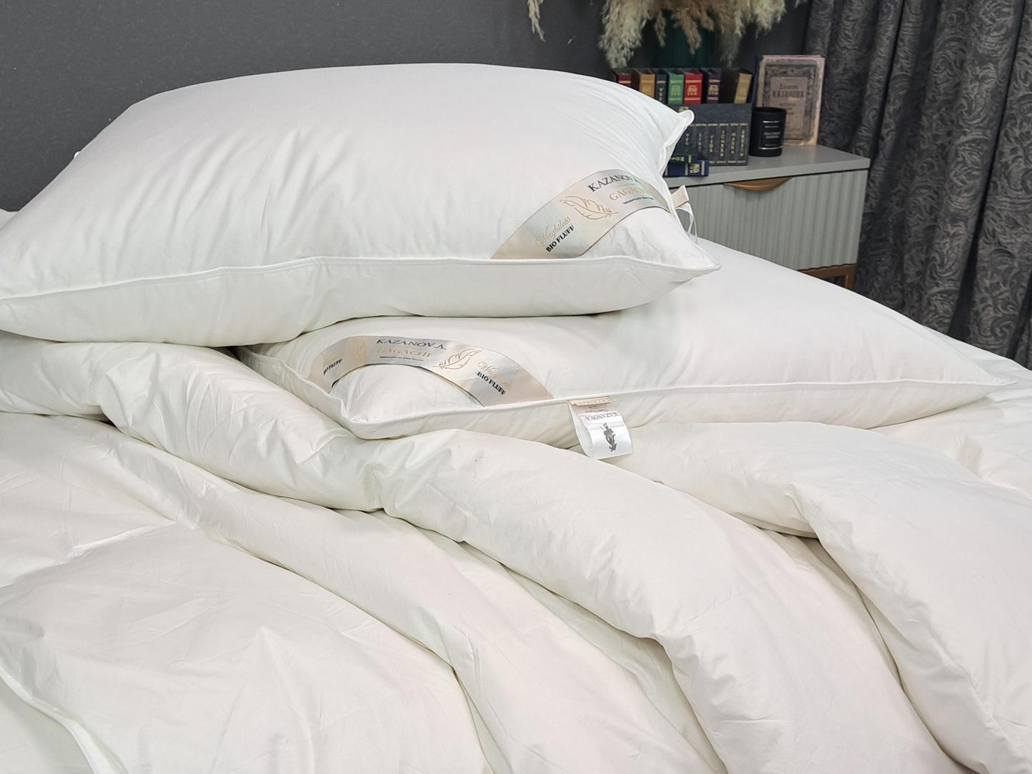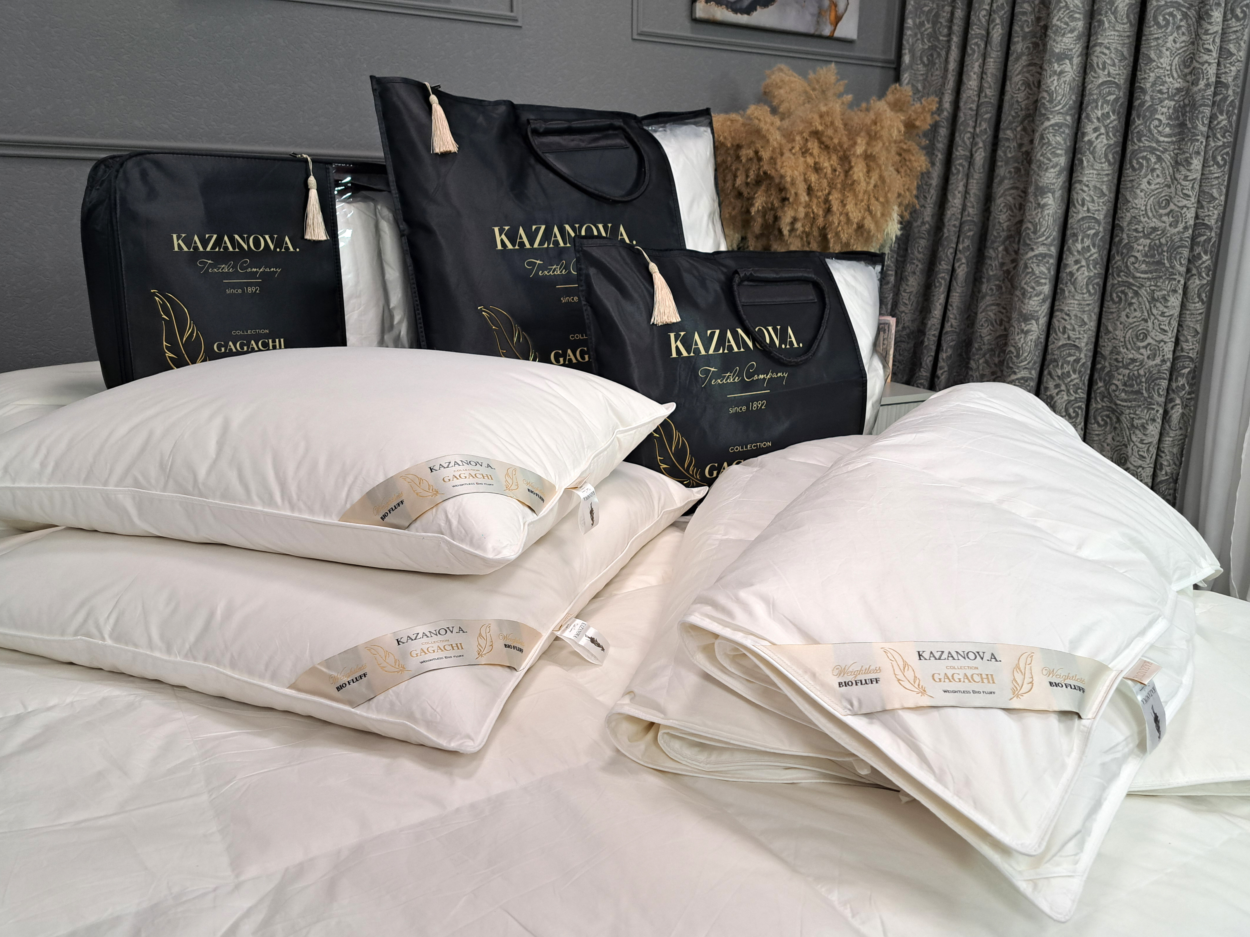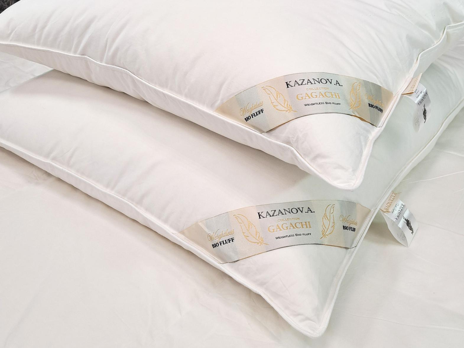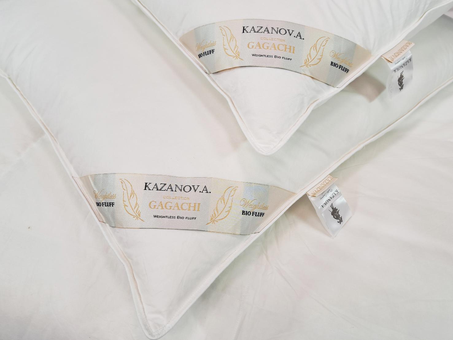 В качестве материала для ткани чехла подушек и одеял серии GAGACHI торговой марки "Kazanov.A" используется 100% хлопок. Наполнитель – инновационное волокно пух Гагачи – представляет собой смесь пушинок и отборных микро-перышек, максимально приближенную к свойствам натуральной пухо-перовой смеси. Подушки обладают прекрасными анатомическими свойствами, мягко разгружая и поддерживая шею во время сна. Одеяла GAGACHI отличаются равномерным распределением наполнителя: тепло ощущается мягким, без перегрева и лишней тяжести. Изделия остаются пышными и легкими на протяжении всего срока службы.