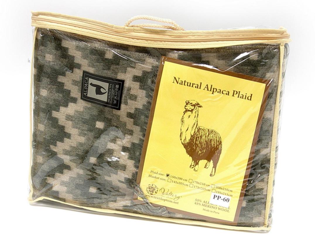 Плед INCALPACA (Перу) серии PP выполнен из смеси шерсти альпаки и мериноса. Шерсть альпаки обладает большой способностью сохранять тепло, что достигается за счёт наличия в составе её волокон микроскопических пузырьков. Присутствие в составе шерсти мериноса животного воска-ланолина оказывает оздоравливающее воздействие на людей, страдающих заболеваниями опорно-двигательного аппарата.
