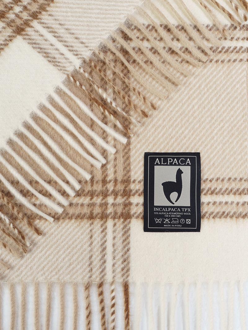 Плед INCALPACA (Перу) серии PP выполнен из смеси шерсти альпаки и мериноса. Шерсть альпаки обладает большой способностью сохранять тепло, что достигается за счёт наличия в составе её волокон микроскопических пузырьков. Присутствие в составе шерсти мериноса животного воска-ланолина оказывает оздоравливающее воздействие на людей, страдающих заболеваниями опорно-двигательного аппарата.