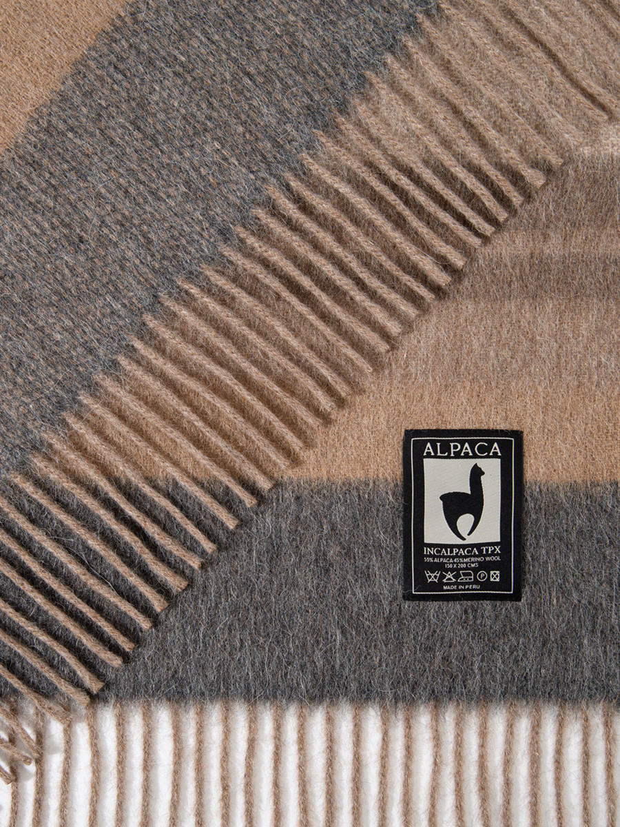 Плед INCALPACA (Перу) серии PP выполнен из смеси шерсти альпаки и мериноса. Шерсть альпаки обладает большой способностью сохранять тепло, что достигается за счёт наличия в составе её волокон микроскопических пузырьков. Присутствие в составе шерсти мериноса животного воска-ланолина оказывает оздоравливающее воздействие на людей, страдающих заболеваниями опорно-двигательного аппарата.