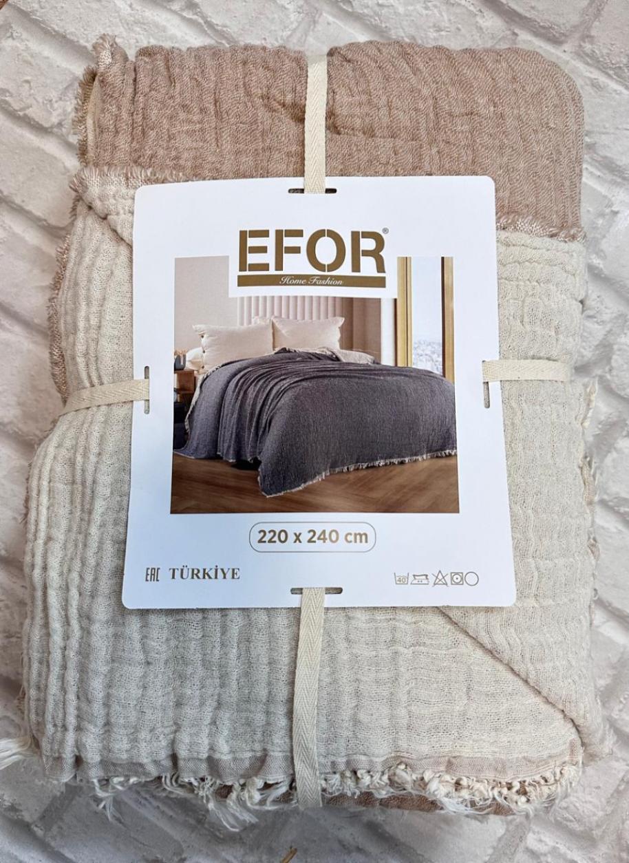 Муслиновые пледы торговой марки "EFOR" выполнены из 100% хлопка. Хлопковые пледы отличаются натуральностью, гигроскопичностью, воздухопроницаемостью и гипоаллергенностью. Пледы декорированы бахромой (кистями). В качестве ухода может быть рекомендована как ручная, так и машинная стирка без отжима при температуре не более 40 градусов Цельсия.
