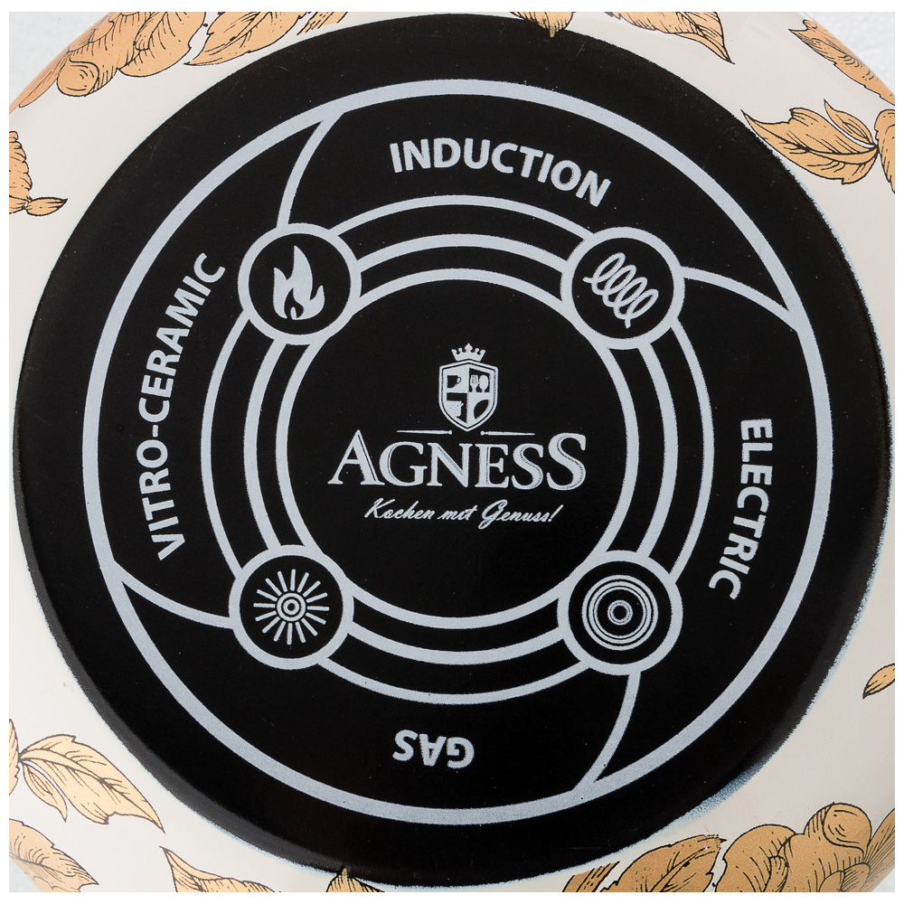 Кастрюля с крышкой данной серии ТМ "Agness" изготовлена из стали с эмалированным покрытием и может использоваться для газовой, электрической и индукционной плиты.
