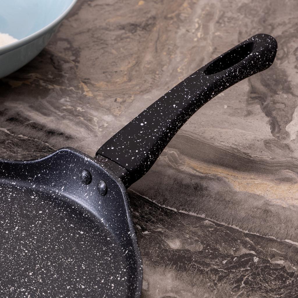 Блинная сковорода с антипригарным покрытием "BLACK MARBLE" выполнена из прессованного алюминия. Ручка из бакелита с мягким покрытием SOFT TOUCH не нагревается, обеспечивая безопасное использование изделия. Антипригарное покрытие Pfluon создано на основе гранита и усилено минералами.