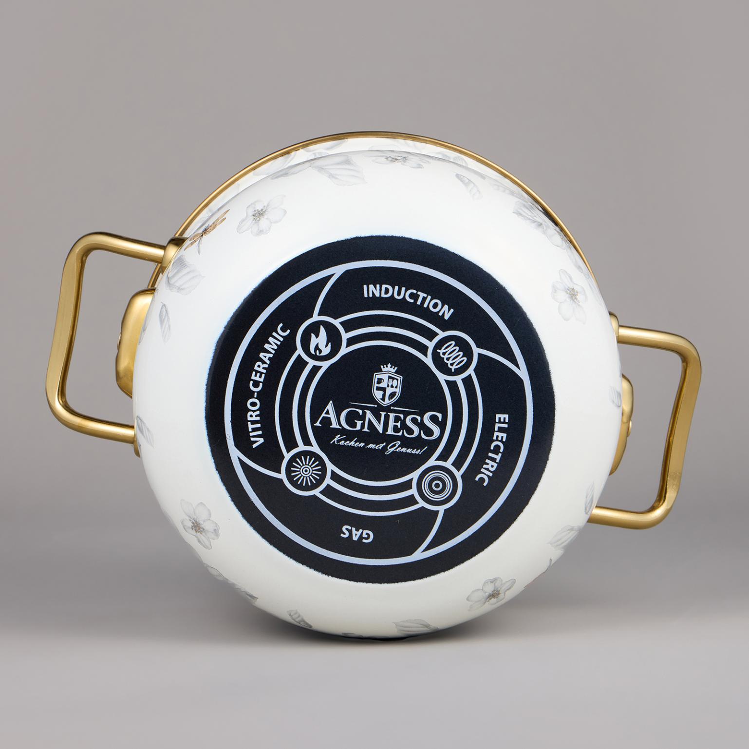 Кастрюли с крышкой данной серии ТМ "Agness" изготовлены из стали с эмалированным покрытием и подходят для газовой, электрической и индукционной плиты. Титановое покрытие ручек и ободка надёжно защищает изделия от коррозии.