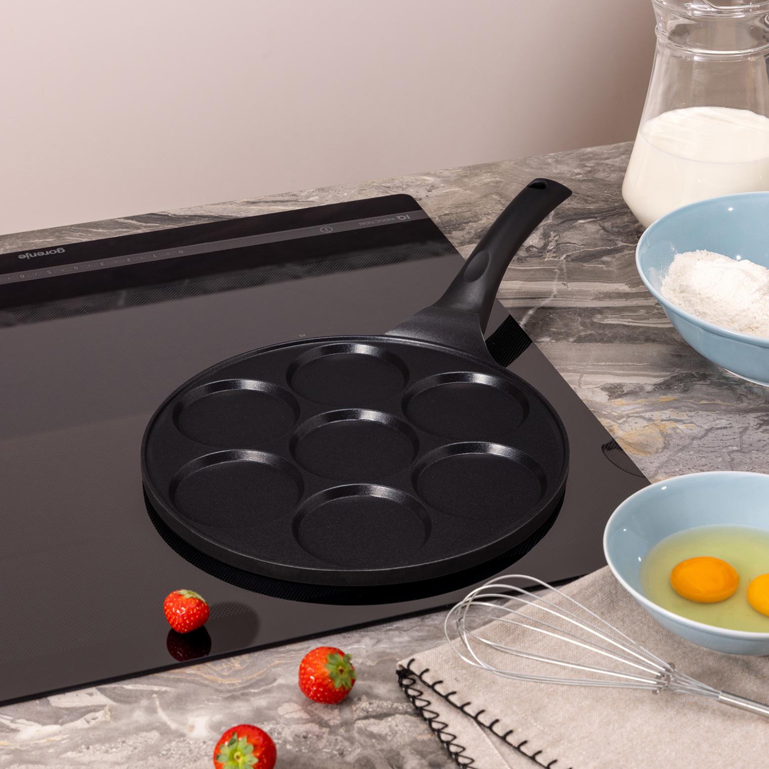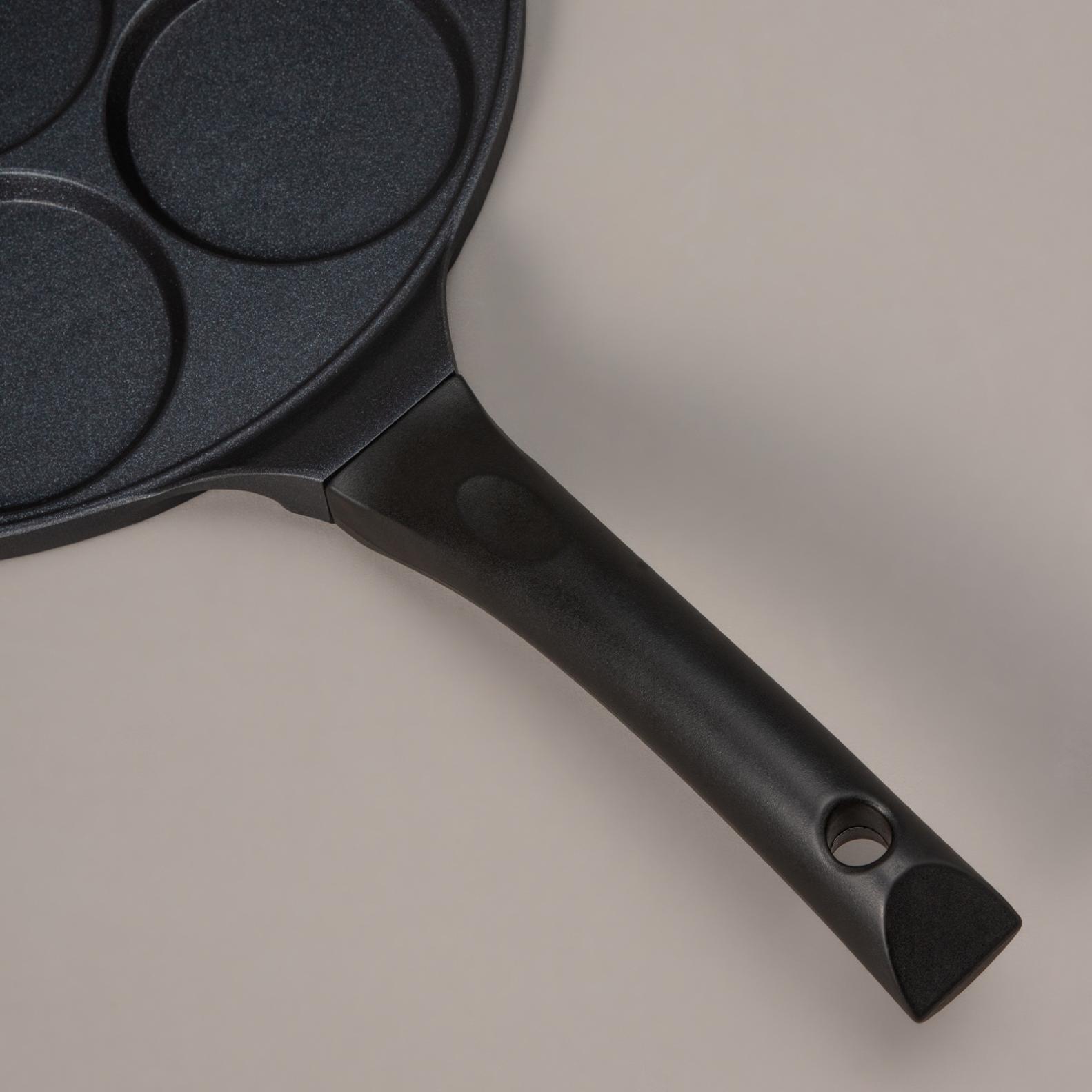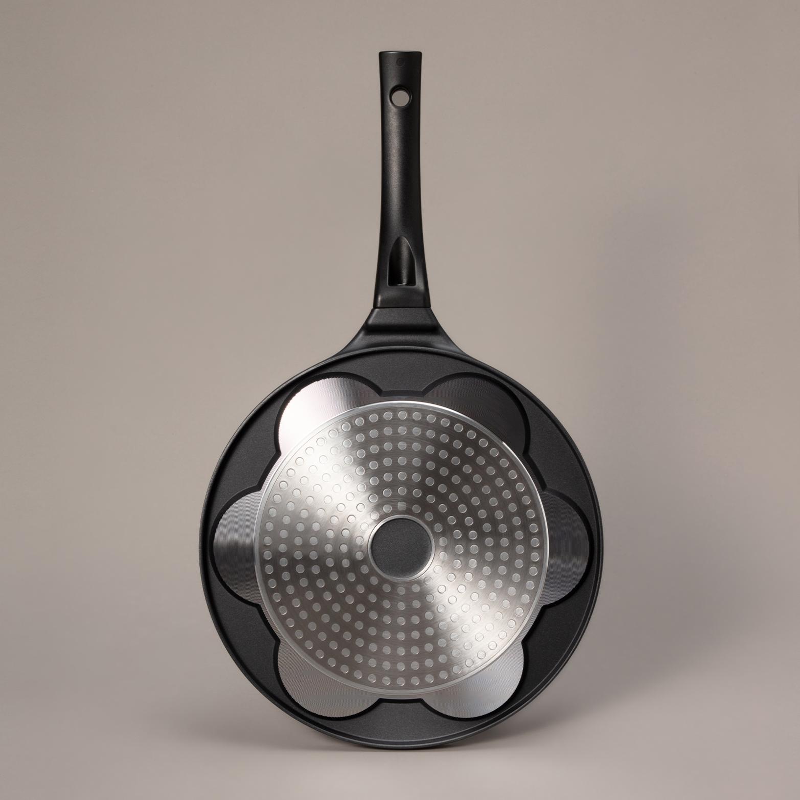- Корпус сковороды выполнен из литого алюминия, что обеспечивает равномерное распределение тепла по всей поверхности изделия;