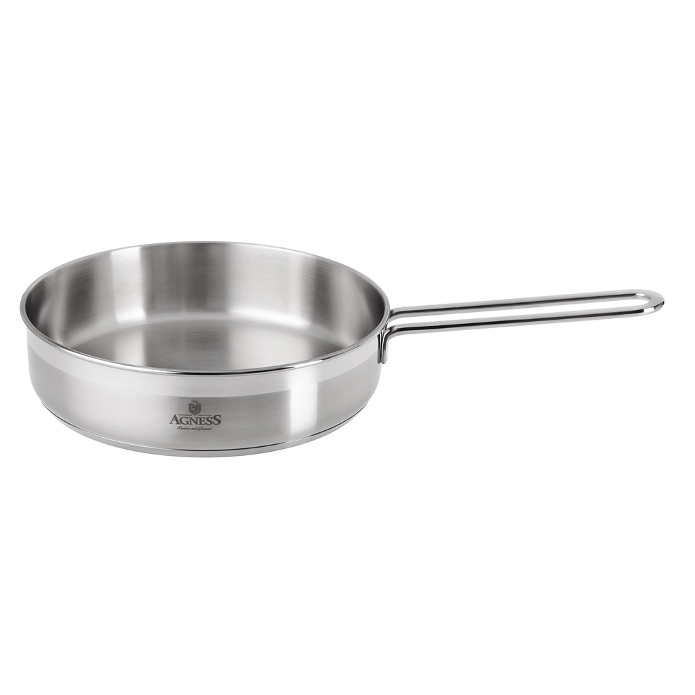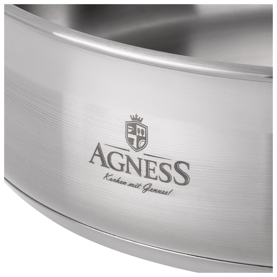 Сковорода AGNESS PROFESSIONAL выполнена из нержавеющей, хромоникелевой стали 18/10. Подходит для всех типов плит, включая индукционные.