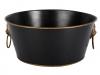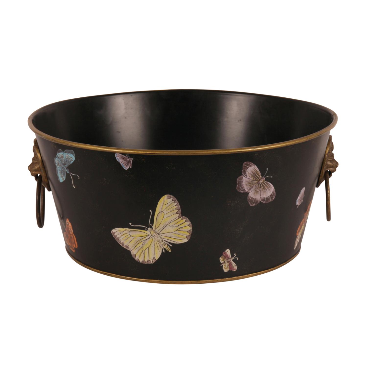 Изысканное круглое кашпо ручной работы с ручками в виде львиных голов черного цвета с рисунком в виде бабочек.
