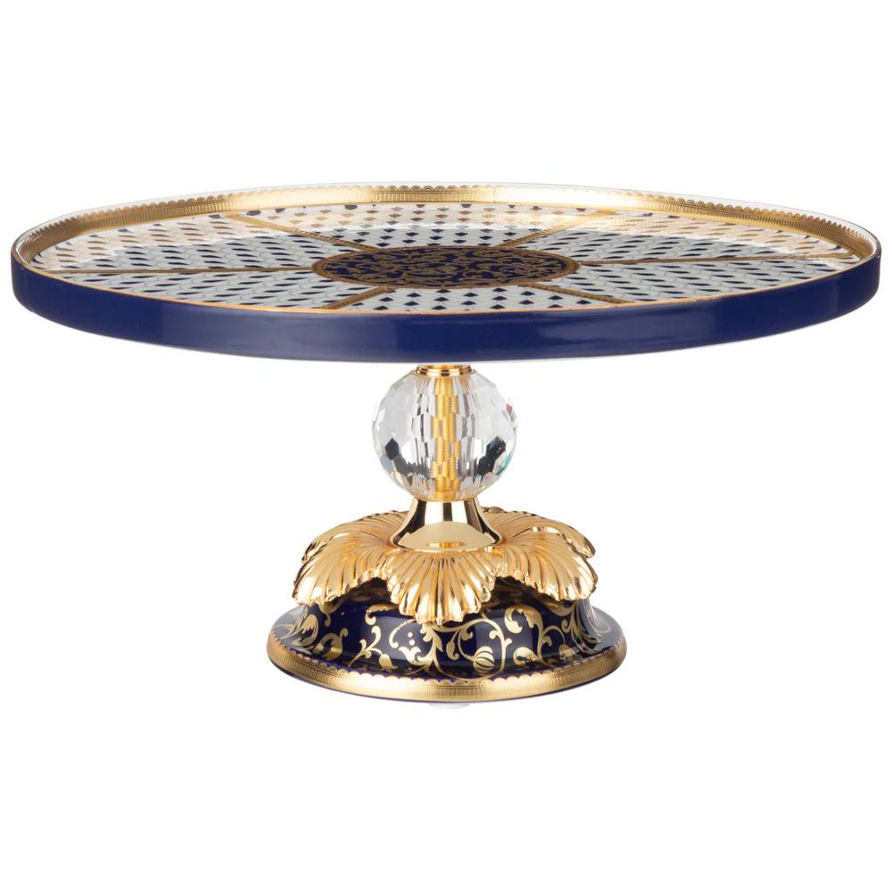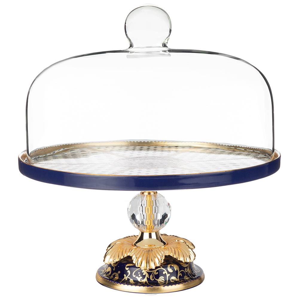 Блюдо со стеклянной крышкой для сервировки праздничного стола выполнено в комбинации фарфора и металла с бронзовым декором .
