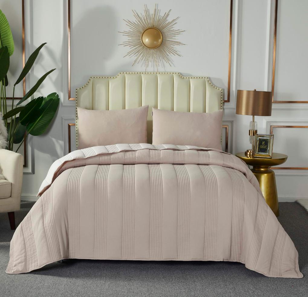 Комплект двустороннего стёганого покрывала "Саломея" с наволочками выполнен из хлопка и вискозы, нежной на ощупь и практичной в использовании: ткань не линяет при стирке, обладает отличной воздухопроницаемостью, гипоаллергенна.