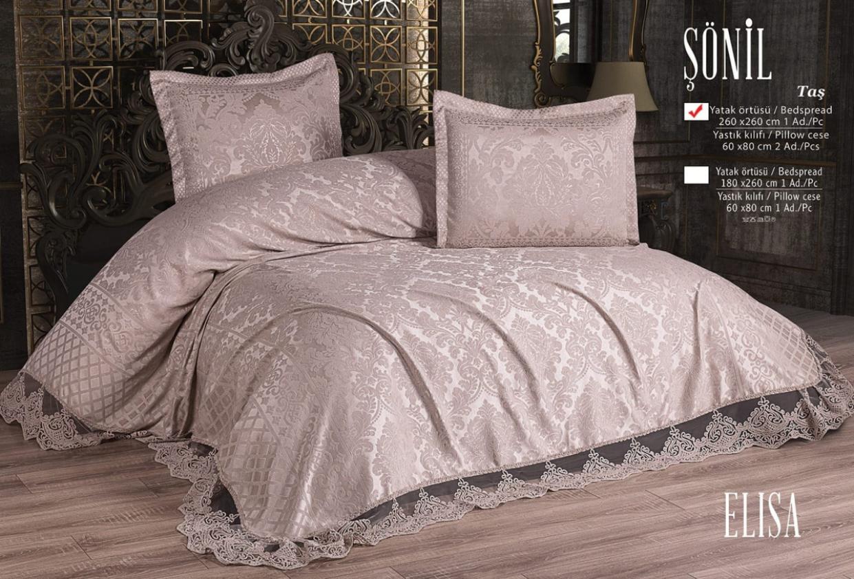 Для производства жаккардовых покрывал с наволочками серии "ELISA" торговой марки «EFOR» (Турция) используется полиэстер с добавлением шенилловых волокон. Жаккардовое плетение обеспечивает покрывалам не только благородный внешний вид, но и повышает их плотность, износостойкость и долговечность.