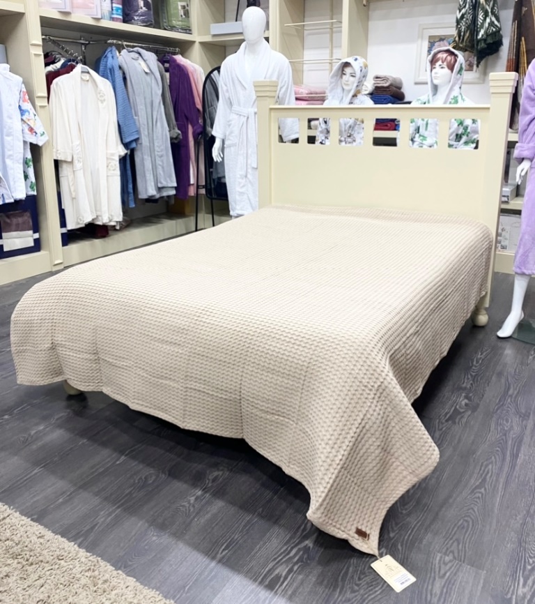 При производстве вафельного покрывала ТМ "Ambiella" применяется 100% хлопок, что обеспечивает изделию абсолютную экологичность, гипоаллергенность, высокий уровень воздухопроницаемости и гигроскопичности. Покрывало выполнено в однотонном формате и в летний период может использоваться в качестве лёгкого одеяла.
