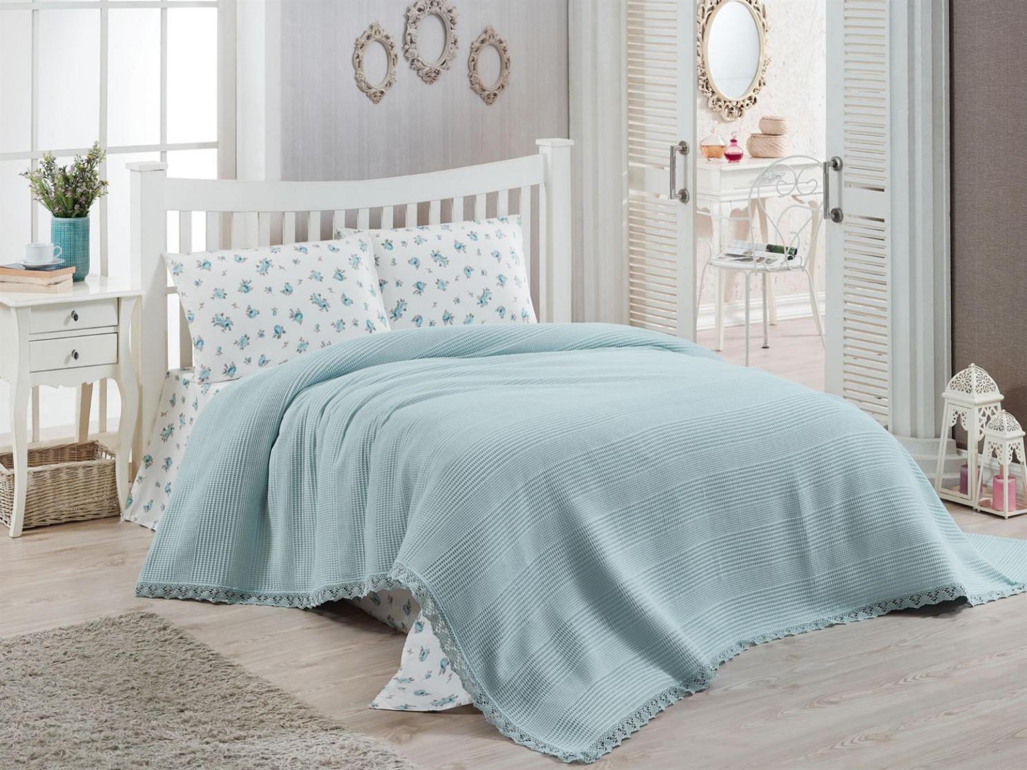 Для производства однотонного покрывала серии "PETEK" торговой марки "DO&CO" используется вафельная ткань, выполненная из 100% хлопка. Покрывало по периметру декорировано гипюром в стиле прованс. Этому изделию свойственны воздухопроницаемость и гигроскопичность, гипоаллергенность и антибактериальность, простота в уходе - возможна как ручная, так и машинная стирка при температуре до 40 C. Покрывало можно использовать в летнее время года также в качестве лёгкого одеяла.