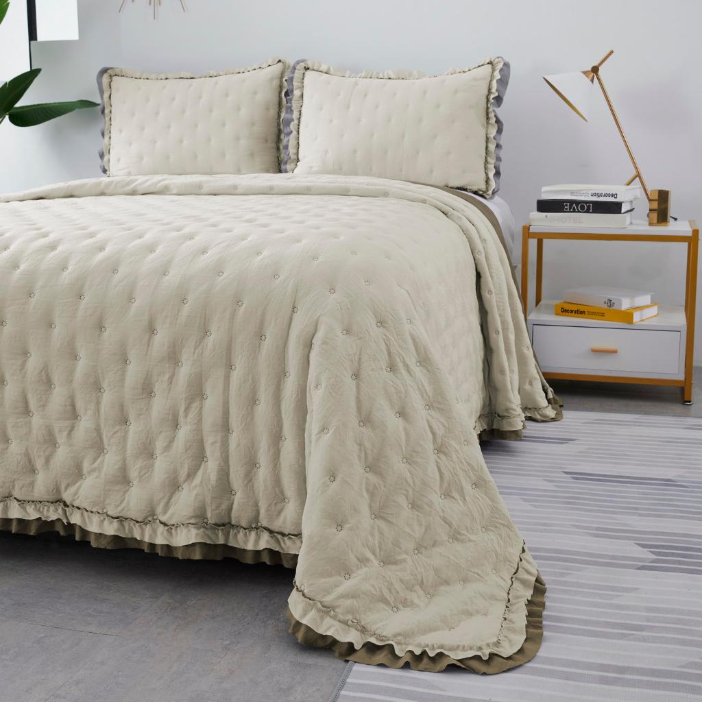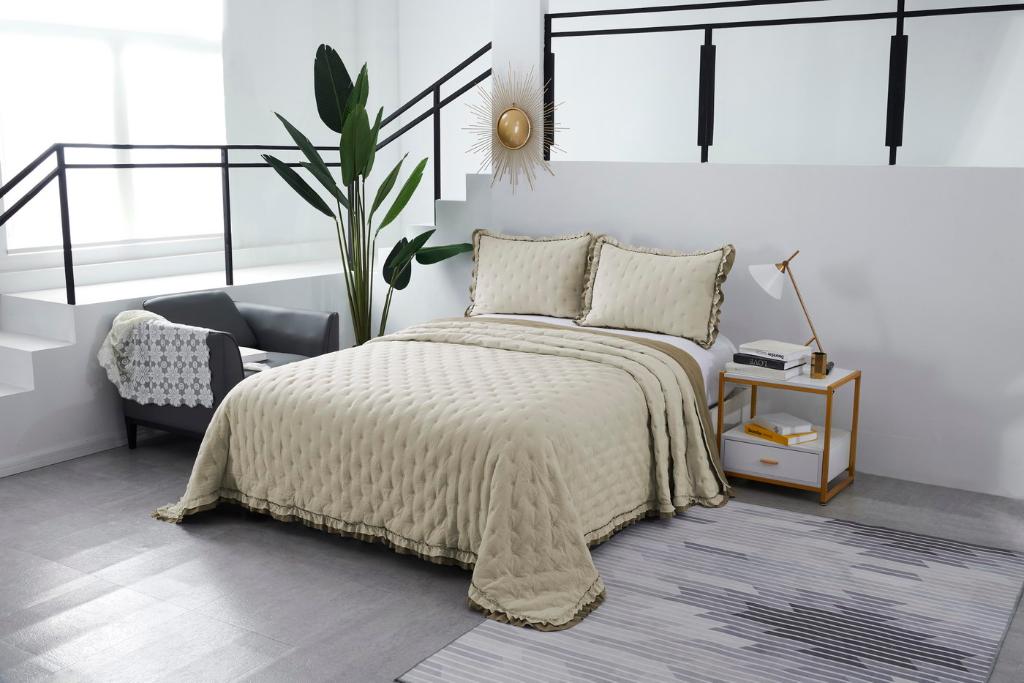 Комплект стёганого (ультрастеп) покрывала "Элизабет" с наволочками с "жатой" структурой ткани выполнен из хлопка и вискозы, нежной на ощупь и практичной в использовании: ткань не линяет при стирке, обладает отличной воздухопроницаемостью, гипоаллергенна. В качестве тонкого слоя наполнителя применяется микро (нано) волокно плотностью 100 гр/м2. Покрывало и наволочки декорированы рюшами (оборкой).