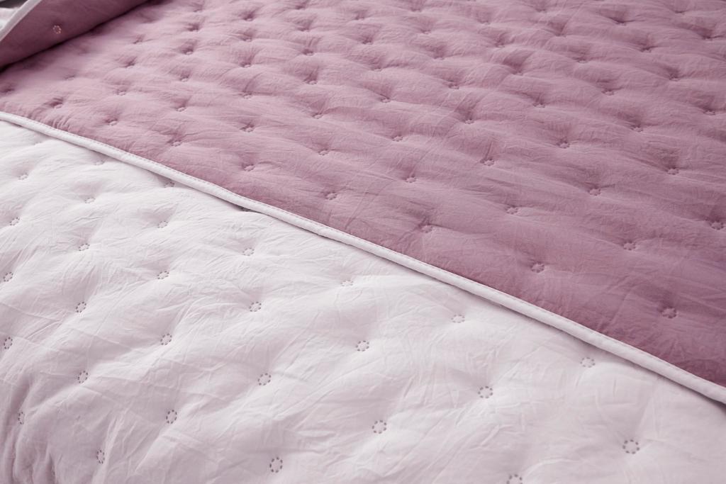 Комплект стёганого (ультрастеп) покрывала "Элизабет" с наволочками с "жатой" структурой ткани выполнен из хлопка и вискозы, нежной на ощупь и практичной в использовании: ткань не линяет при стирке, обладает отличной воздухопроницаемостью, гипоаллергенна. В качестве тонкого слоя наполнителя применяется микро (нано) волокно плотностью 100 гр/м2. Покрывало и наволочки декорированы рюшами (оборкой).