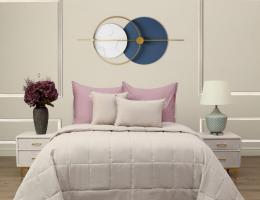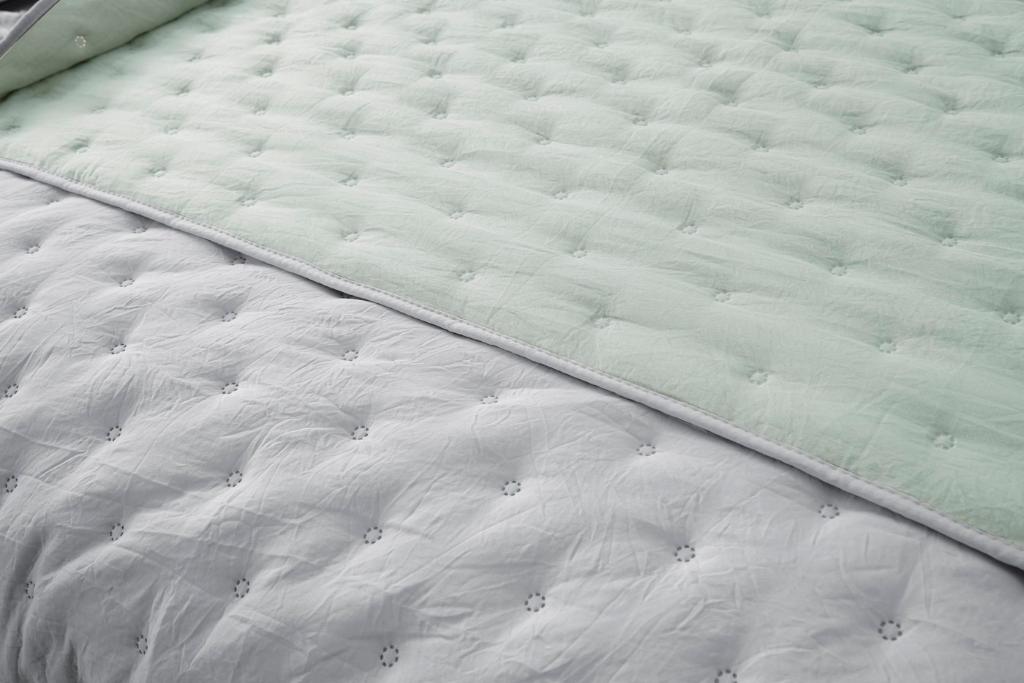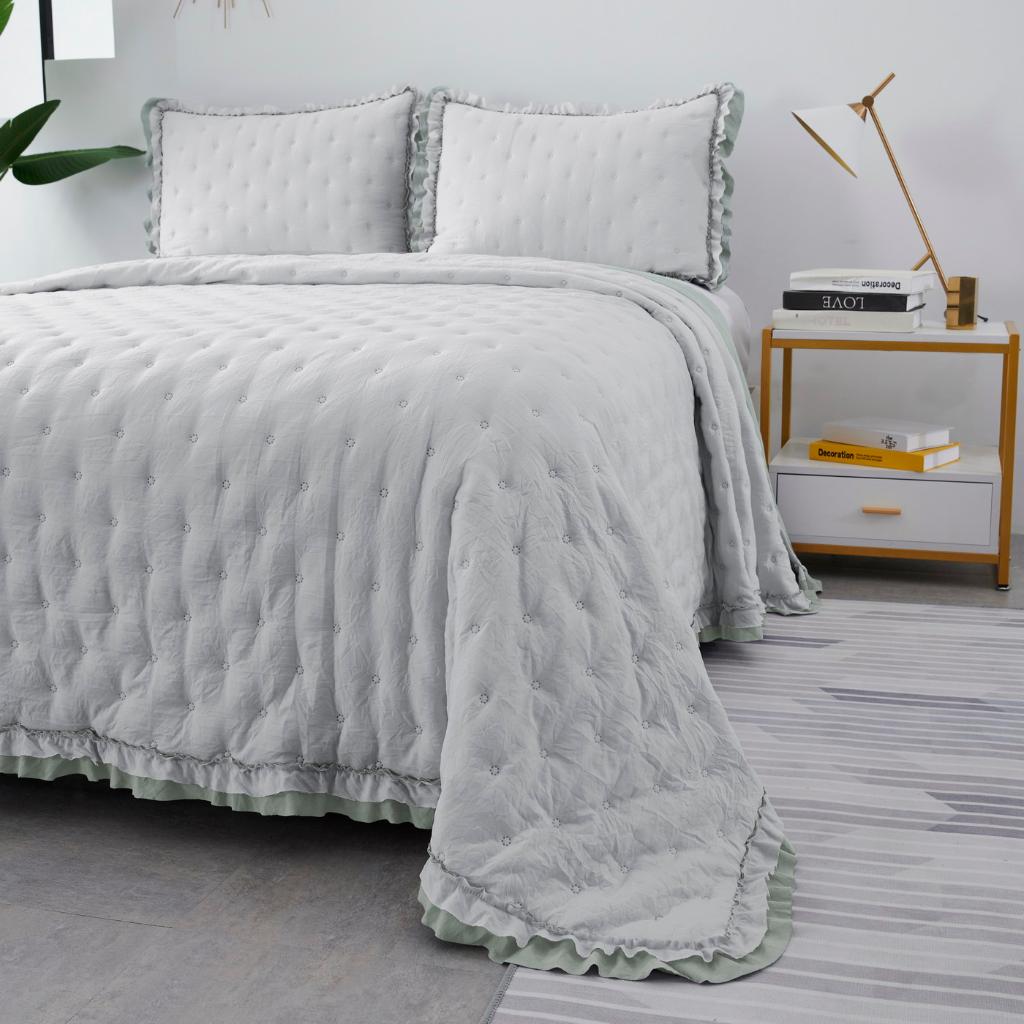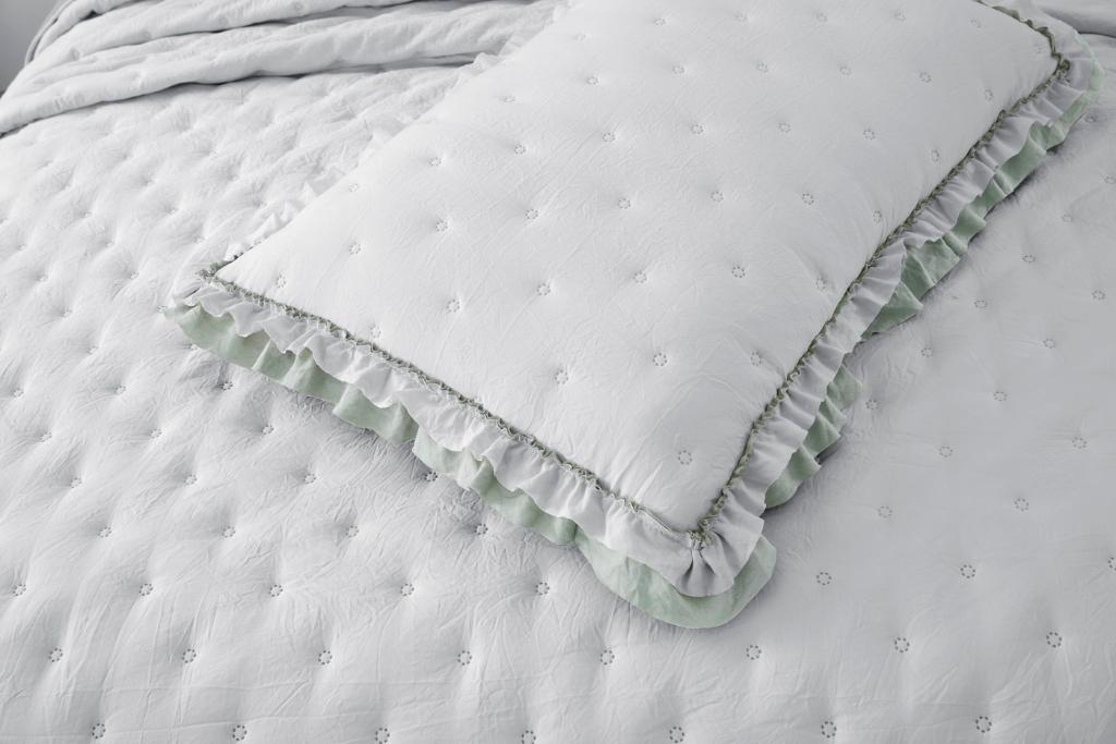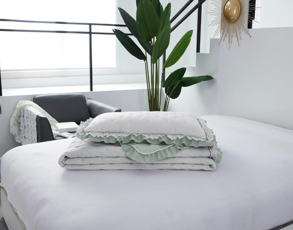 Комплект стёганого (ультрастеп) покрывала "Элизабет" с наволочками с "жатой" структурой ткани выполнен из хлопка и вискозы, нежной на ощупь и практичной в использовании: ткань не линяет при стирке, обладает отличной воздухопроницаемостью, гипоаллергенна. В качестве тонкого слоя наполнителя применяется микро (нано) волокно плотностью 100 гр/м2. Покрывало и наволочки декорированы рюшами (оборкой).
