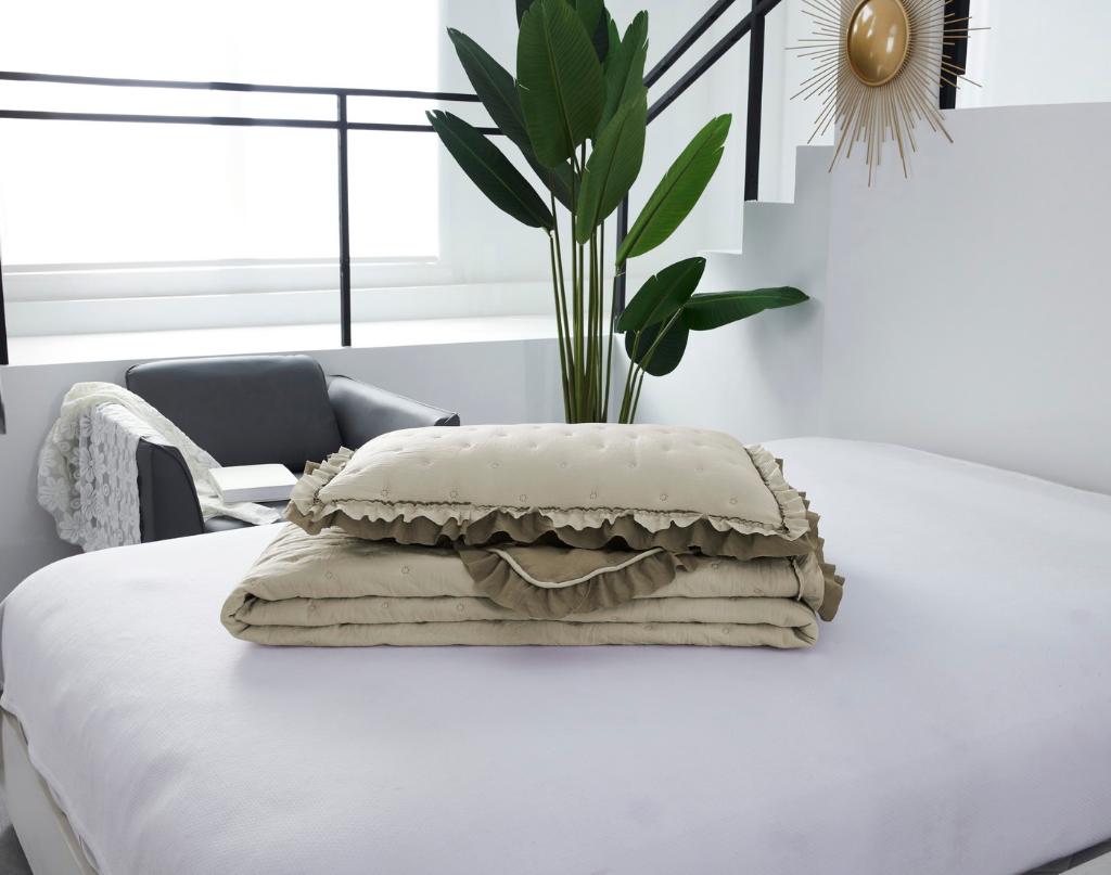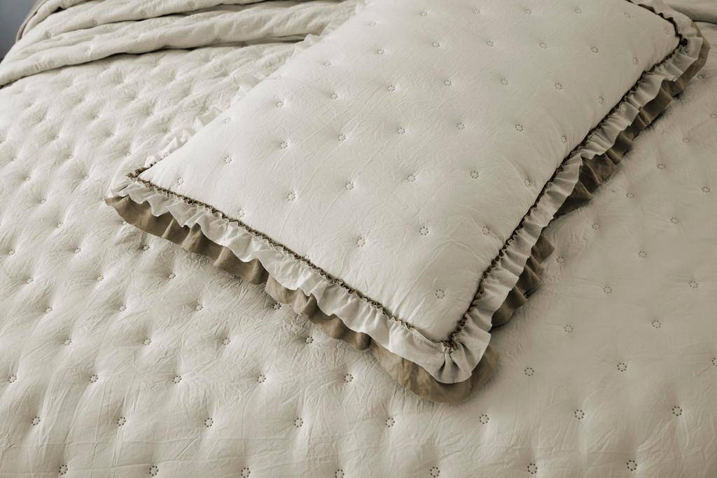 Комплект стёганого (ультрастеп) покрывала "Элизабет" с наволочками с "жатой" структурой ткани выполнен из хлопка и вискозы, нежной на ощупь и практичной в использовании: ткань не линяет при стирке, обладает отличной воздухопроницаемостью, гипоаллергенна. В качестве тонкого слоя наполнителя применяется микро (нано) волокно плотностью 100 гр/м2. Покрывало и наволочки декорированы рюшами (оборкой).