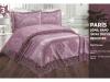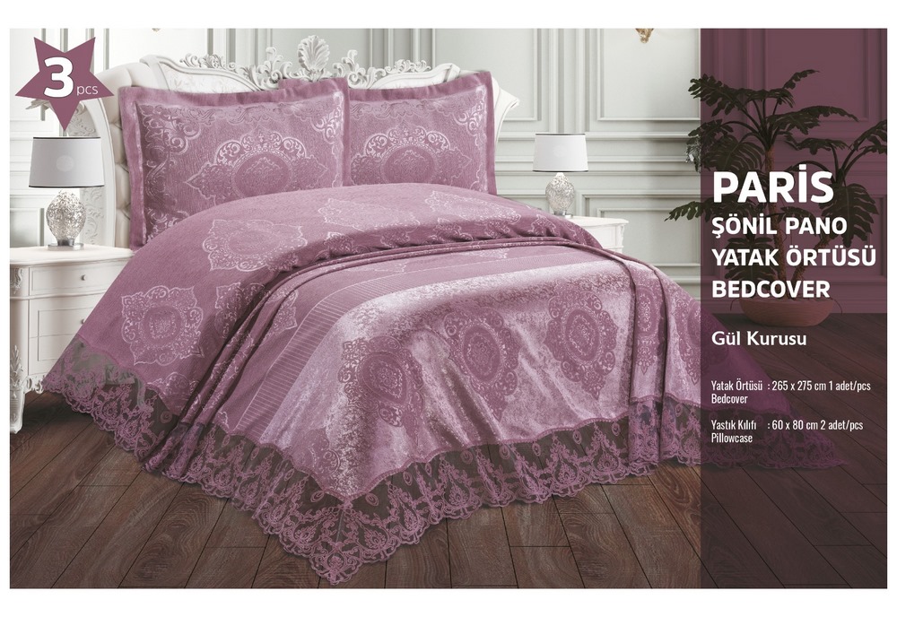 Для производства жаккардовых покрывал с наволочками серии "PARIS" торговой марки «EFOR» (Турция) используется полиэстер с добавлением шенилловых волокон. Жаккардовое плетение обеспечивает покрывалам не только благородный внешний вид, но и повышает их плотность, износостойкость и долговечность. Покрывала декорированы широким кружевом по периметру изделия.
