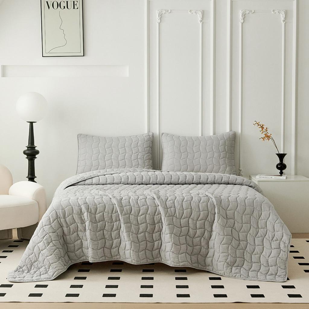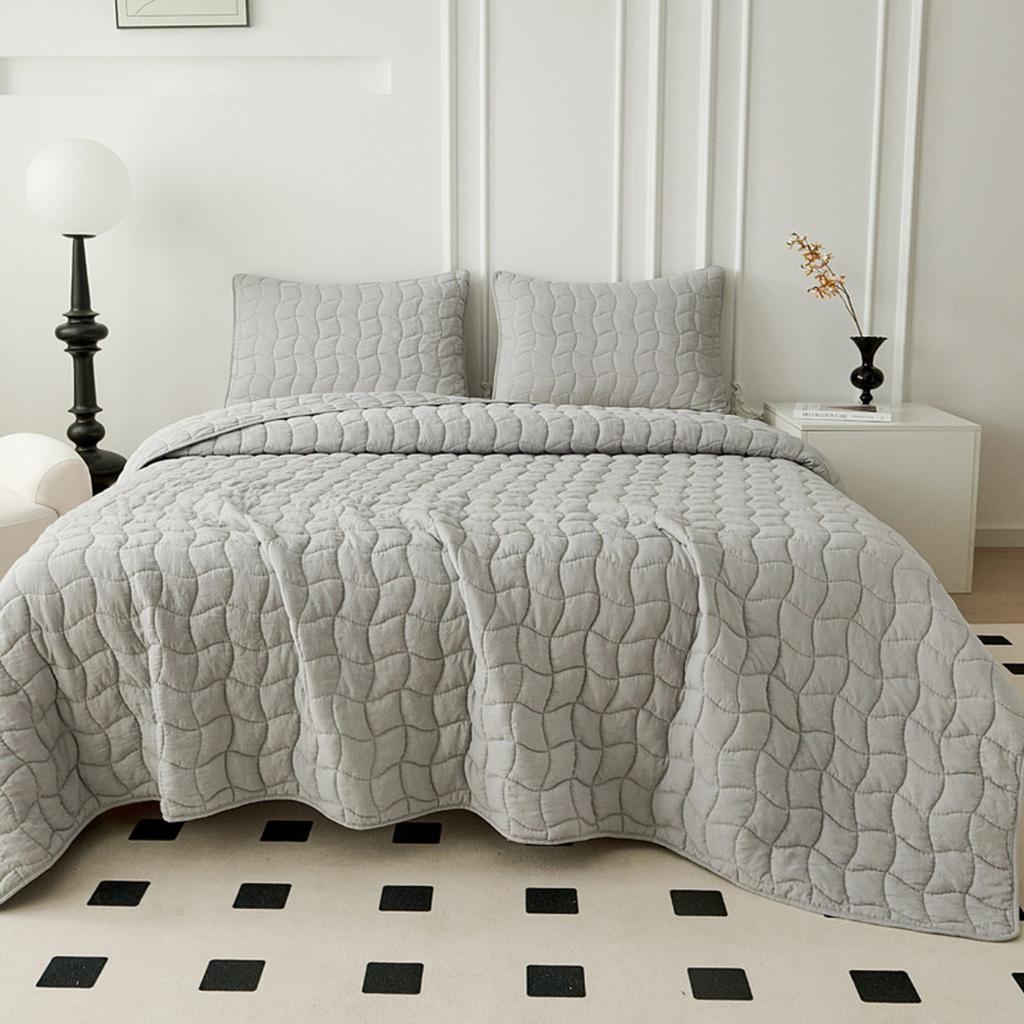 Комплект стёганого покрывала "Минелла" с наволочками с "жатой" структурой ткани выполнен из хлопка и вискозы, нежной на ощупь и практичной в использовании: ткань не линяет при стирке, обладает отличной воздухопроницаемостью, гипоаллергенна.