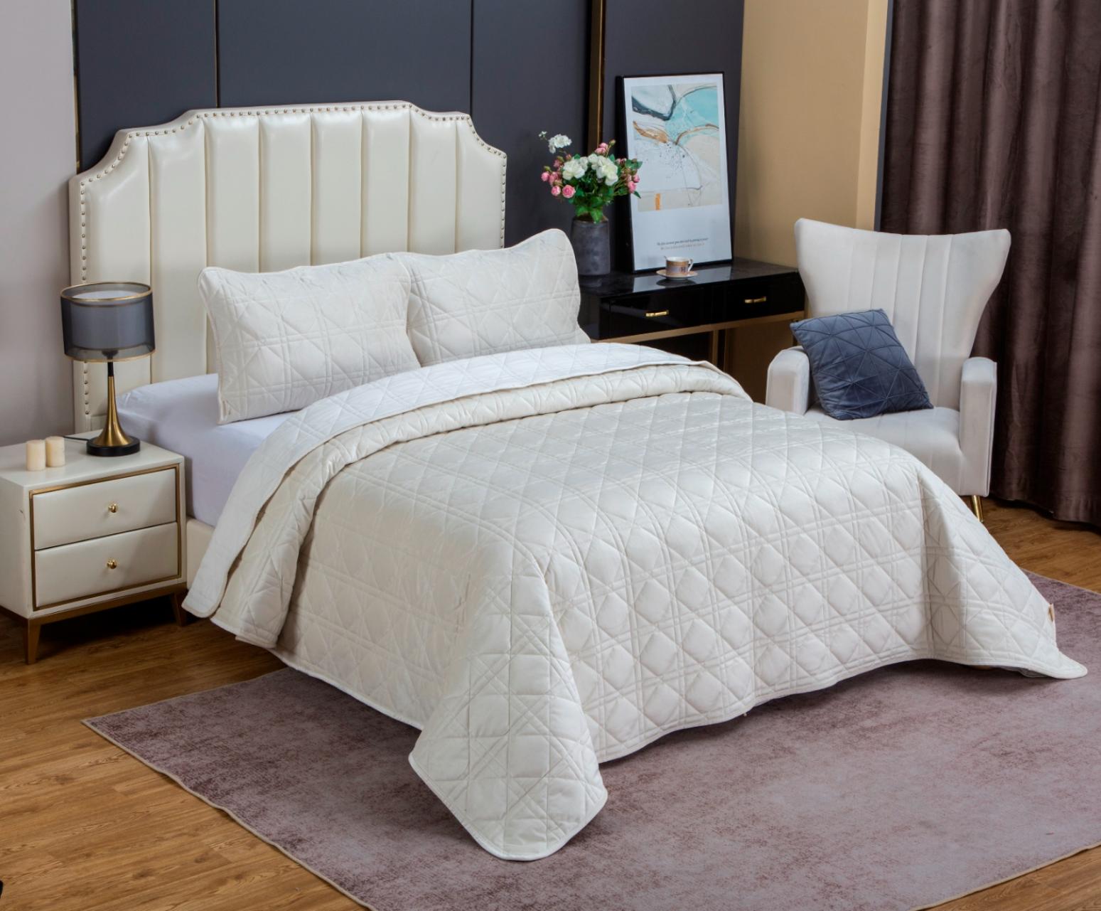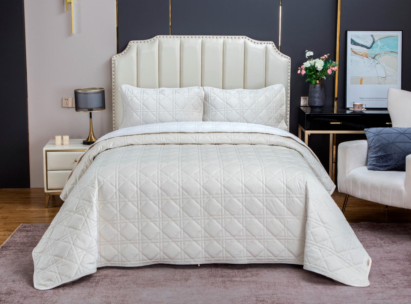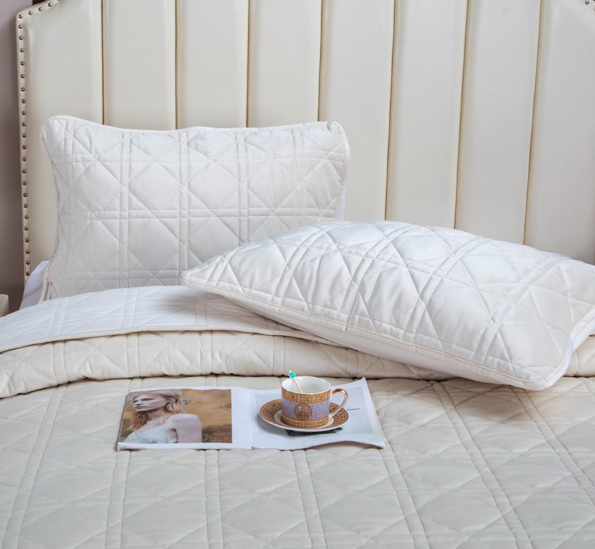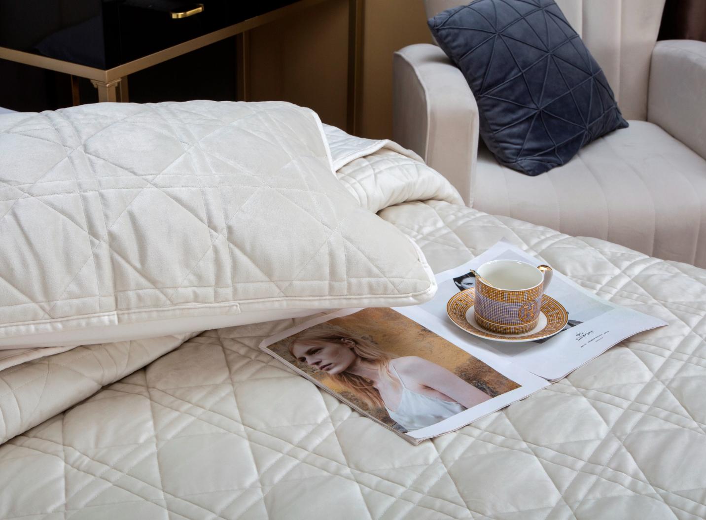 Комплекты стёганого велюрового покрывала коллекции «Dori» с наволочками выполнены из 100% вискозы, нежной на ощупь и практичной в использовании: ткань не линяет при стирке, обладает отличной воздухопроницаемостью, гипоаллергенна. Коллекция представлена в следующих цветах: пыльная орхидея, молоко, изумруд, трюфель, индиго, платина серебро, кремовый капучино, айвори, серый беж.