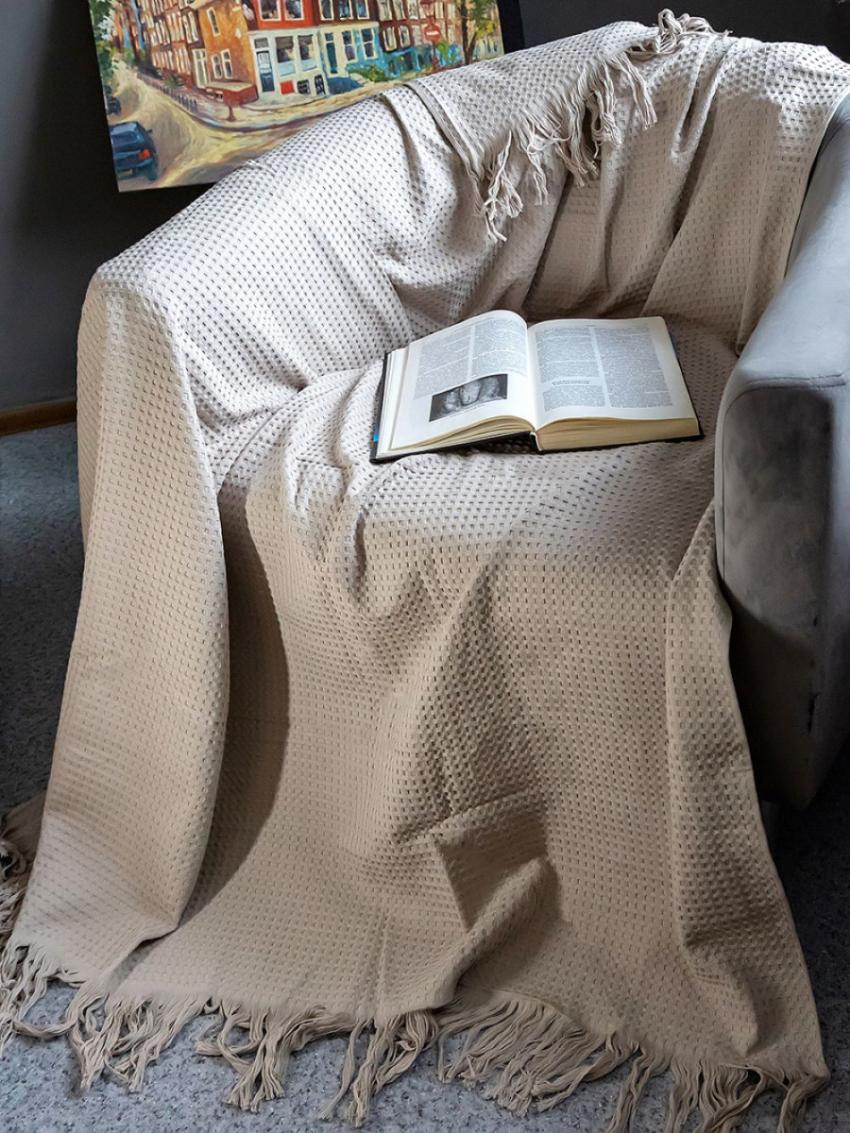 Покрывало вафельное с бахромой Valtery 150х200, коричнево-серый
