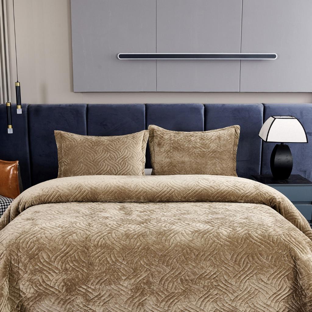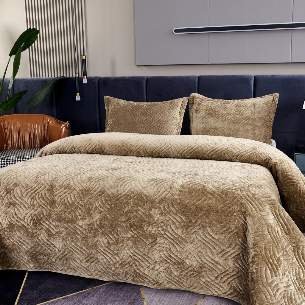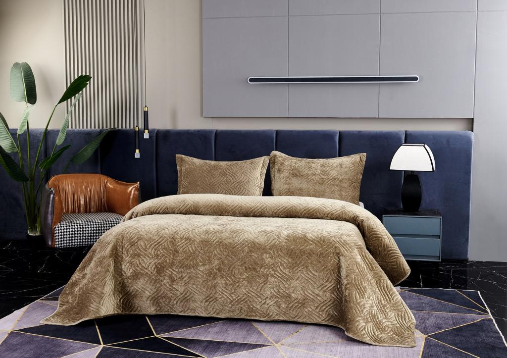 Комплект бархатного покрывала "Деварта" с наволочками выполнен из вискозы, нежной на ощупь и практичной в использовании: ткань не линяет при стирке, обладает отличной воздухопроницаемостью, гипоаллергенна.