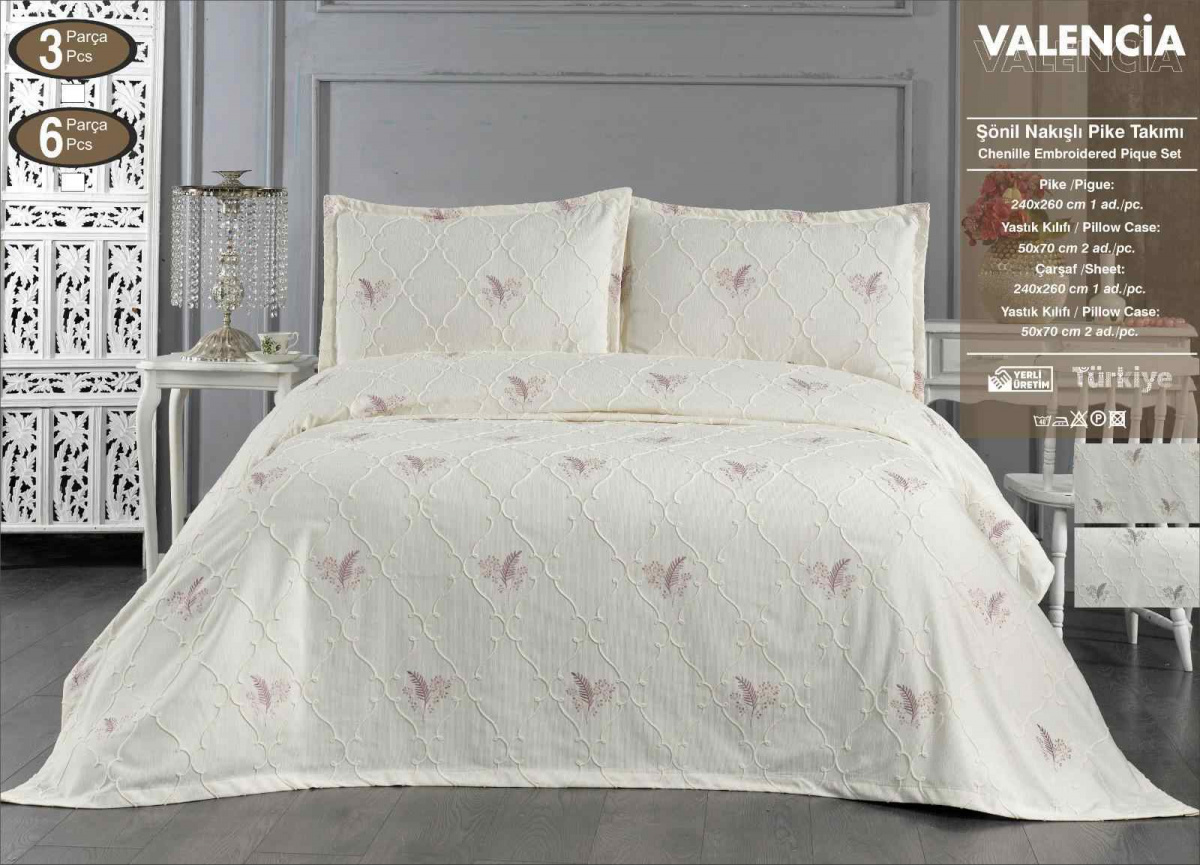 Покрывало серии "VALENCIA" торговой марки "EFOR" выполнено на хлопковой основе с вышивкой из шенилловой нити, что обеспечивает изделию гармоничное сочетание приятных тактильных ощущений, прочности и долговечности.