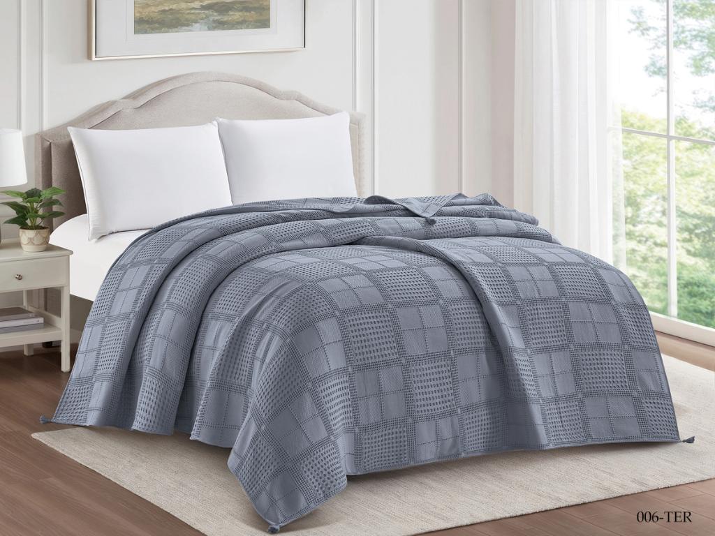 При производстве вафельного покрывала "TERRY" ТМ "CLEO" применяется 100% варёный хлопок, что обеспечивает изделию абсолютную экологичность, гипоаллергенность, высокий уровень воздухопроницаемости и гигроскопичности. Покрывало выполнено в однотонном формате и в летний период может использоваться в качестве лёгкого одеяла. Изделие декорировано кисточками по уголкам.