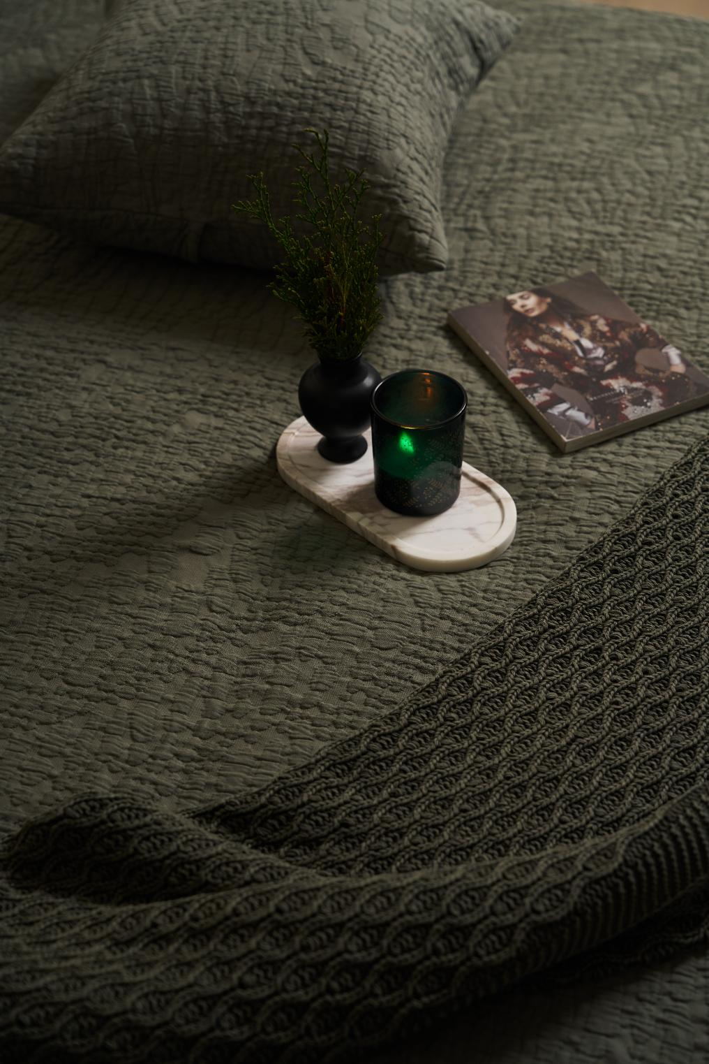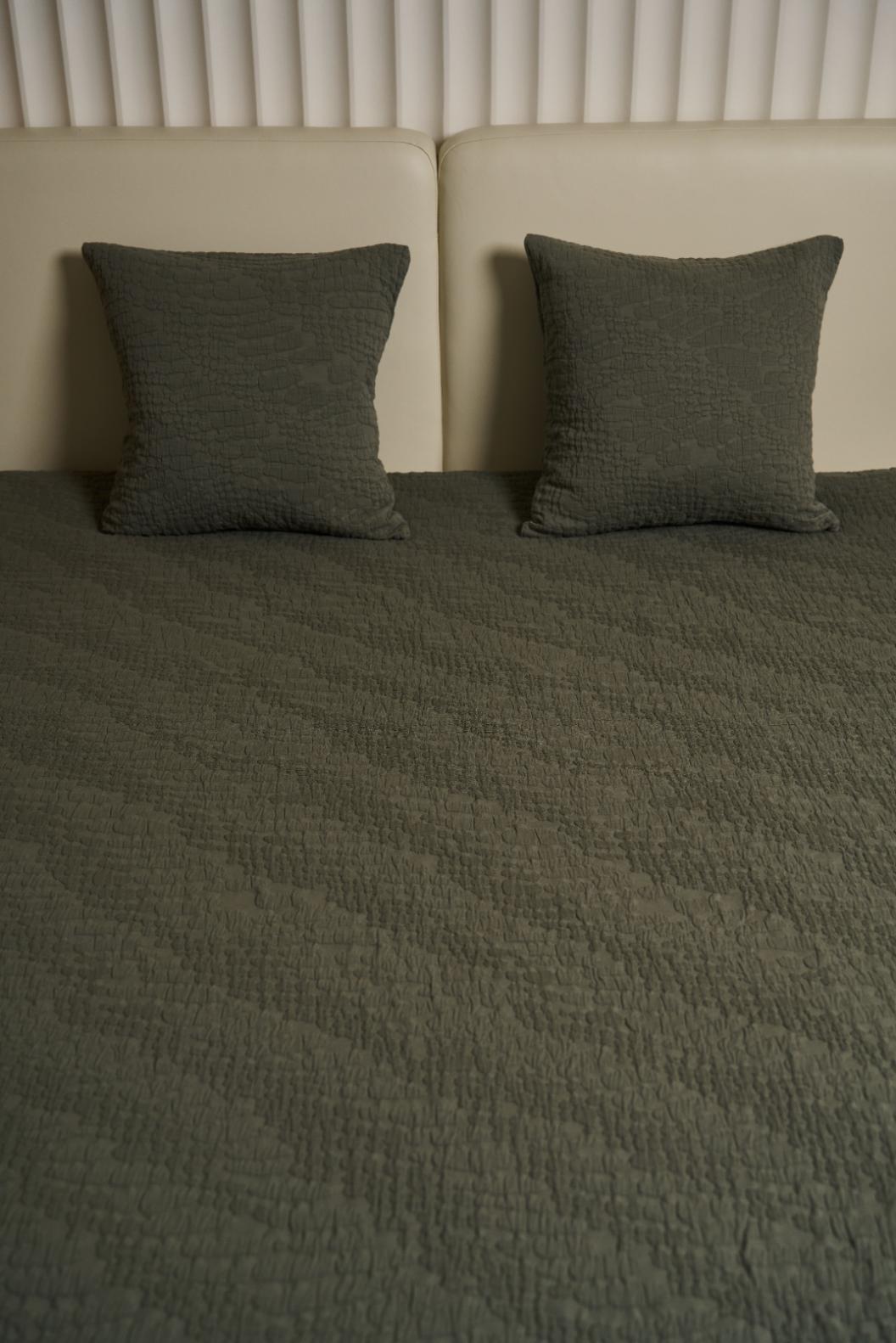 Для производства покрывал серии "TREE BARK" используется 100% хлопок, что обеспечивает изделиям абсолютную экологичность и гипоаллергенность. Дизайн - цвет насыщенный зелёный хаки, рельеф напоминает кору дерева, объёмная фактура с 3D-эффектом. Обратная сторона мягкая, хлопковая, противоскользящая. Дополнительная обработка - stone washed.