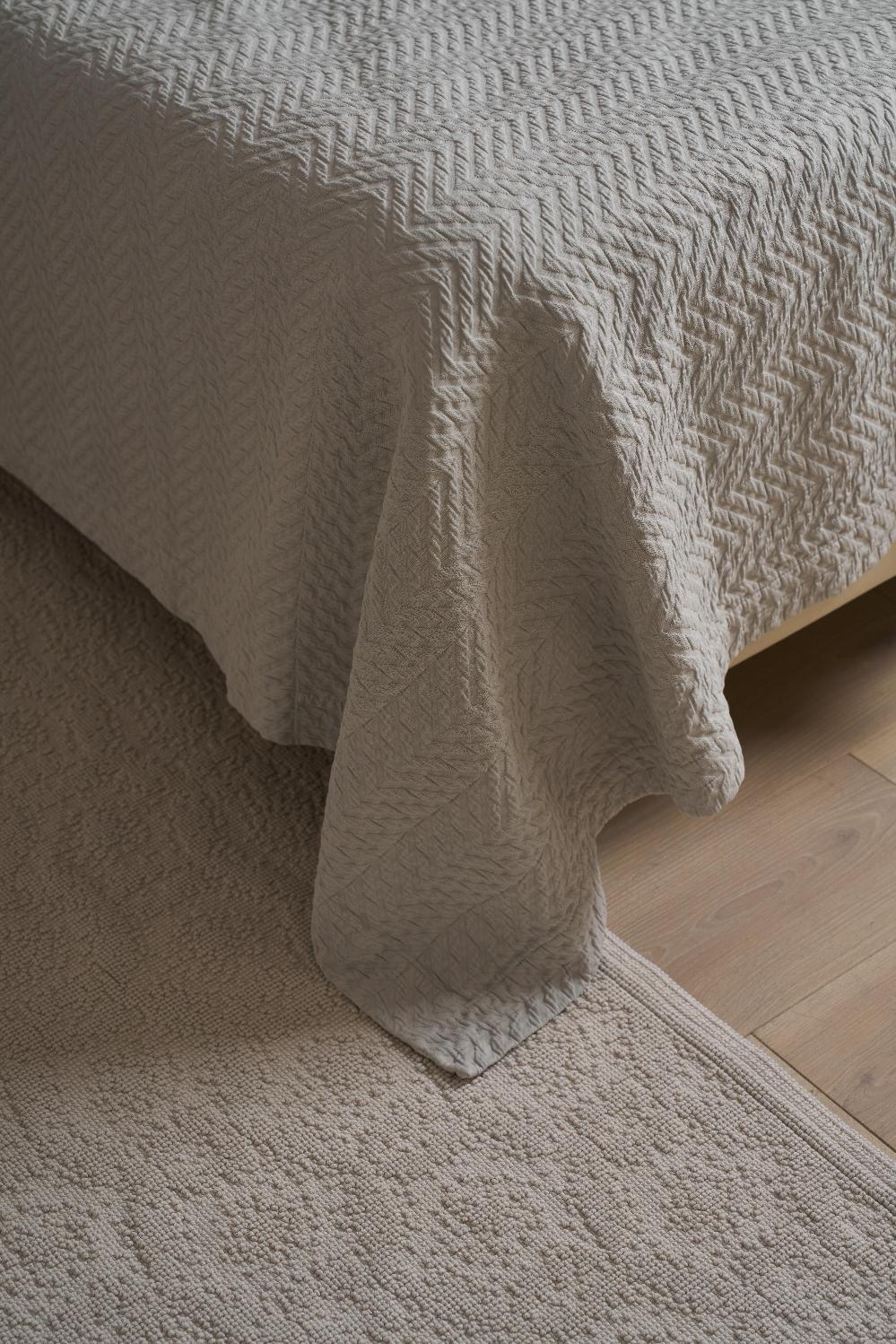 Для производства покрывал серии "ZIGGY" используется 100% хлопок, что обеспечивает изделиям абсолютную экологичность и гипоаллергенность. Дизайн - светло-серый цвет с фисташковым оттенком, объёмные зигзаги с 3D-эффектом. Обратная сторона мягкая, хлопковая, противоскользящая. Дополнительная обработка - stone washed.