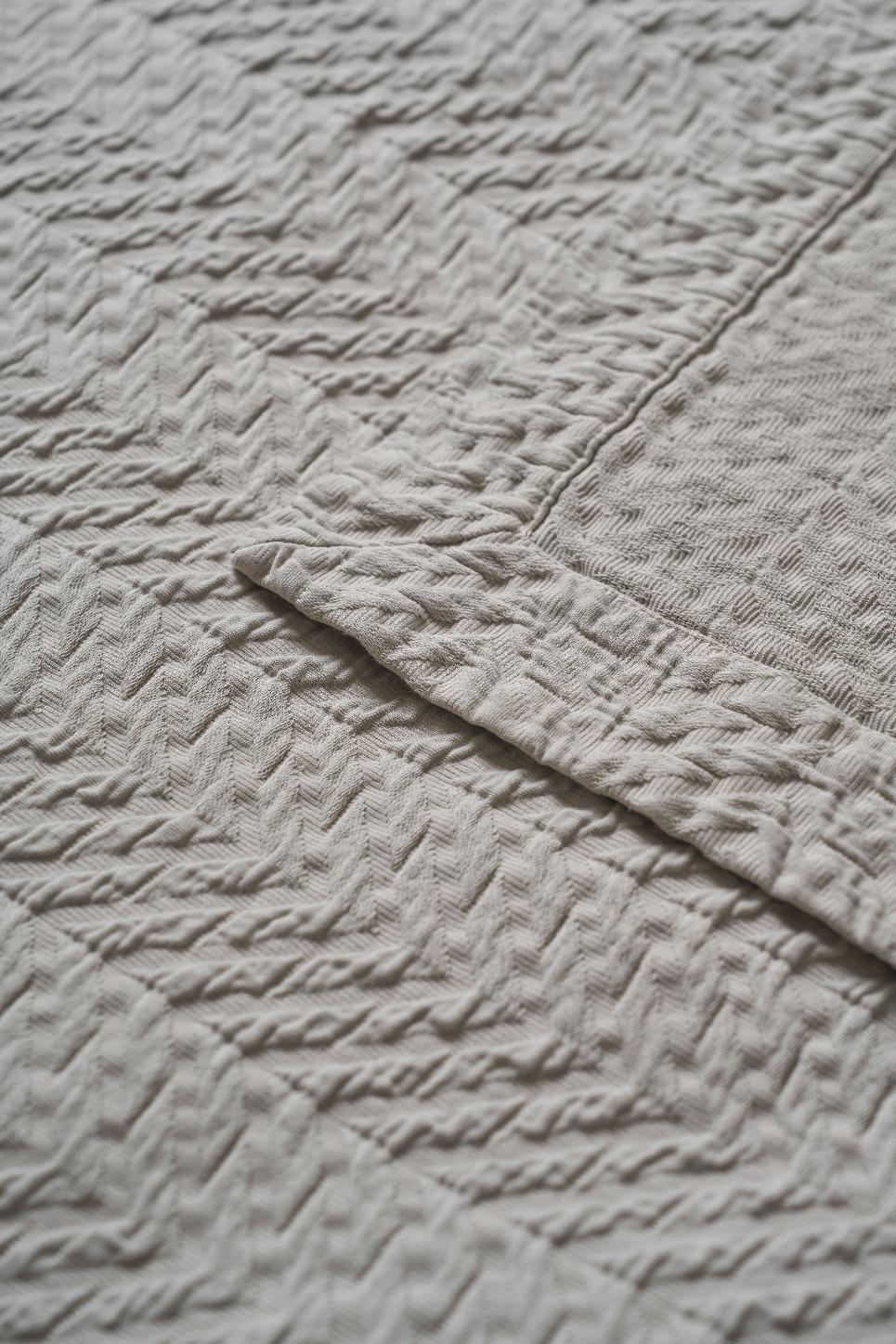 Для производства покрывал серии "ZIGGY" используется 100% хлопок, что обеспечивает изделиям абсолютную экологичность и гипоаллергенность. Дизайн - светло-серый цвет с фисташковым оттенком, объёмные зигзаги с 3D-эффектом. Обратная сторона мягкая, хлопковая, противоскользящая. Дополнительная обработка - stone washed.