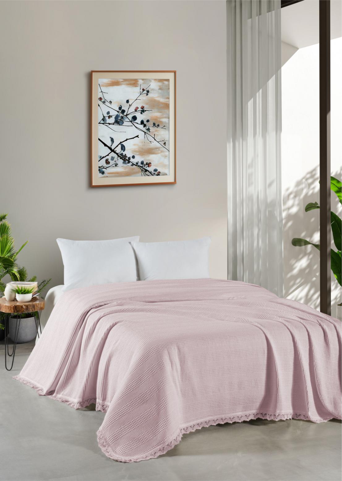 Для производства однотонного покрывала серии "PETEK" торговой марки "DO&CO" используется вафельная ткань, выполненная из 100% хлопка. Покрывало по периметру декорировано гипюром в стиле прованс. Этому изделию свойственны воздухопроницаемость и гигроскопичность, гипоаллергенность и антибактериальность, простота в уходе - возможна как ручная, так и машинная стирка при температуре до 40 C. Покрывало можно использовать в летнее время года также в качестве лёгкого одеяла.