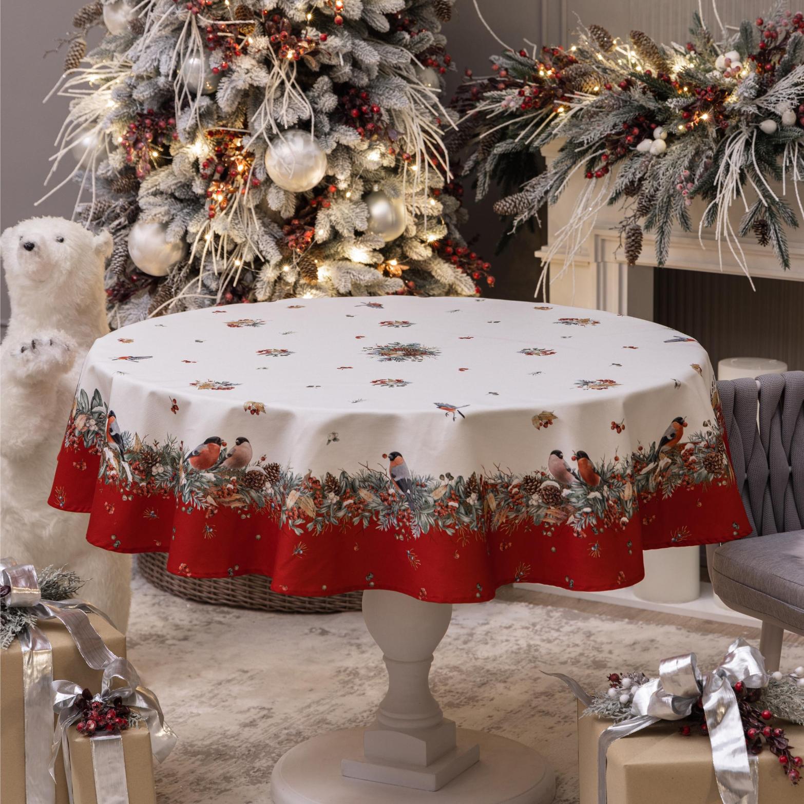 Скатерть круглая с пропиткой SANTALINO "МОРОЗКО.СНЕГИРИ" 150 см, красный