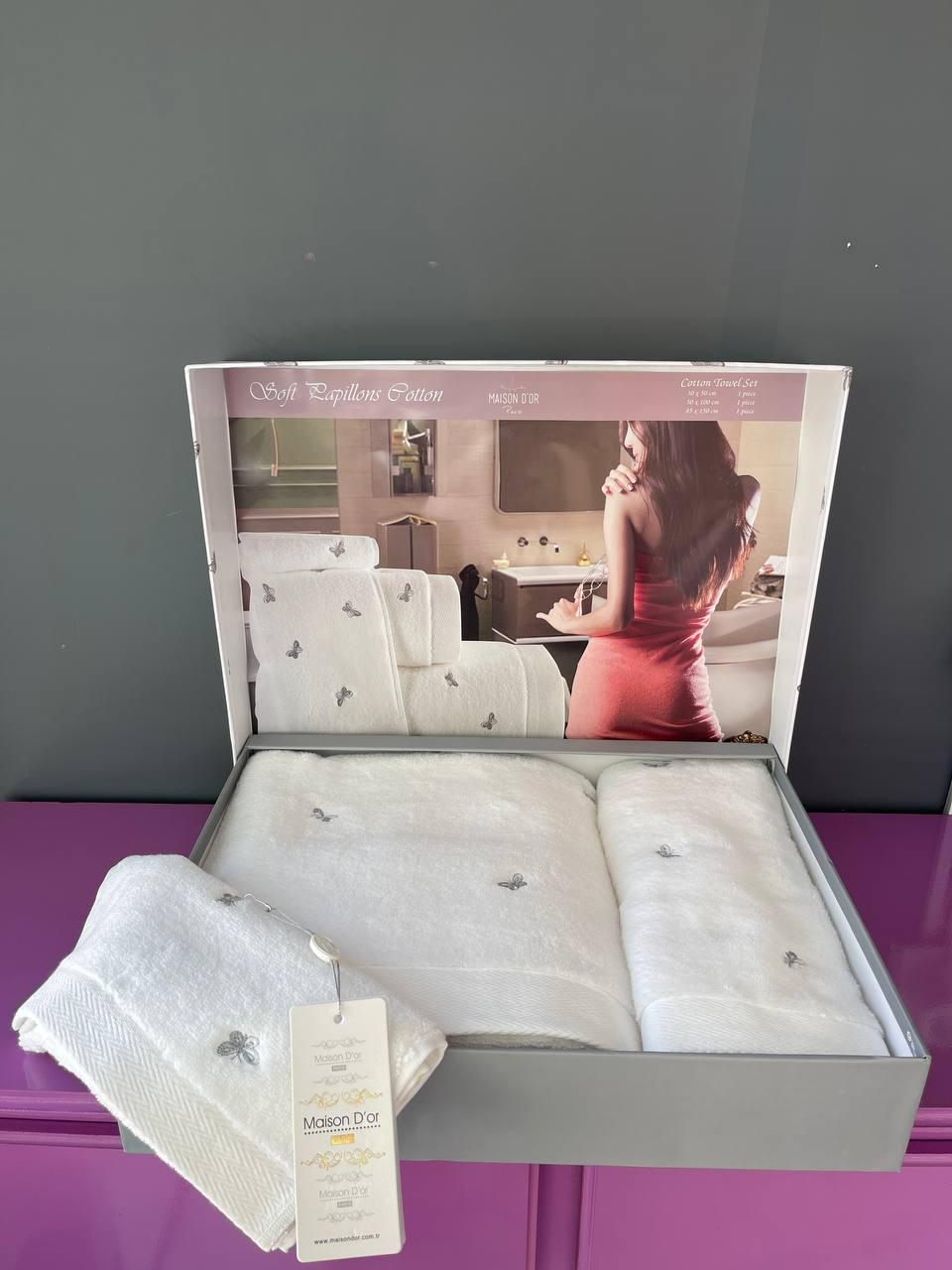 Комплект махровых полотенец 30x50-50x100-85x150 Maison D'or "REVE DE PAPILLON", белый/серый